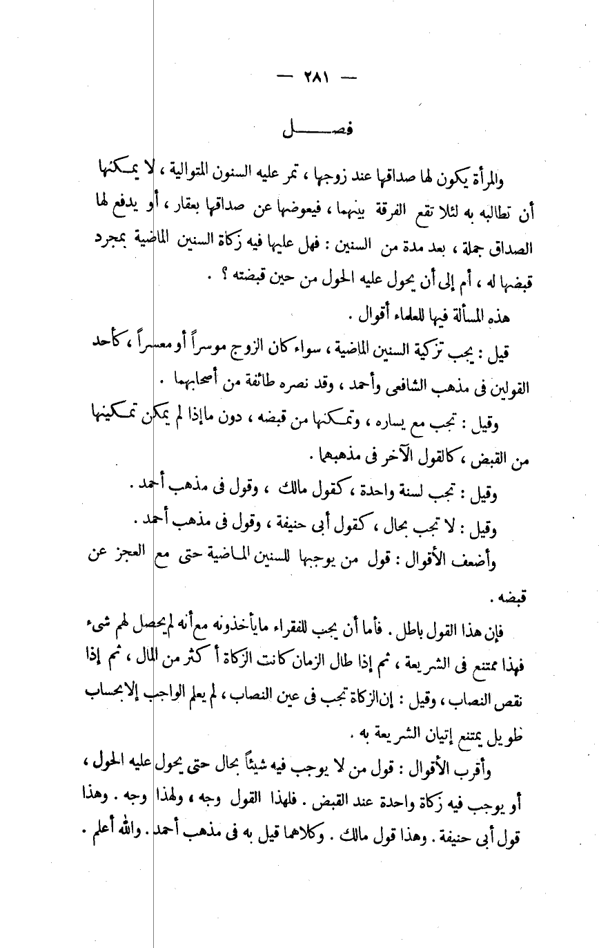 وَالْمَرْأَة يكون لَهَا صَدَاقهَا عِنْد زَوجهَا تمر عَلَيْهِ السنون المتوالية لَا يُمكنهَا أَن تطالبه بِهِ لِئَلَّا تقع الْفرْقَة بَينهمَا فيعوضها عَن صَدَاقهَا بعقار أَو يدْفع لَهَا الصَدَاق جملَة بعد مُدَّة من السنين فَهَل عَلَيْهَا فِيهِ الزَّكَاة السنين الْمَاضِيَة بِمُجَرَّد قبضهَا لَهُ أم إِلَى أَن يحول عَلَيْهِ الْحول من حِين قَبضته