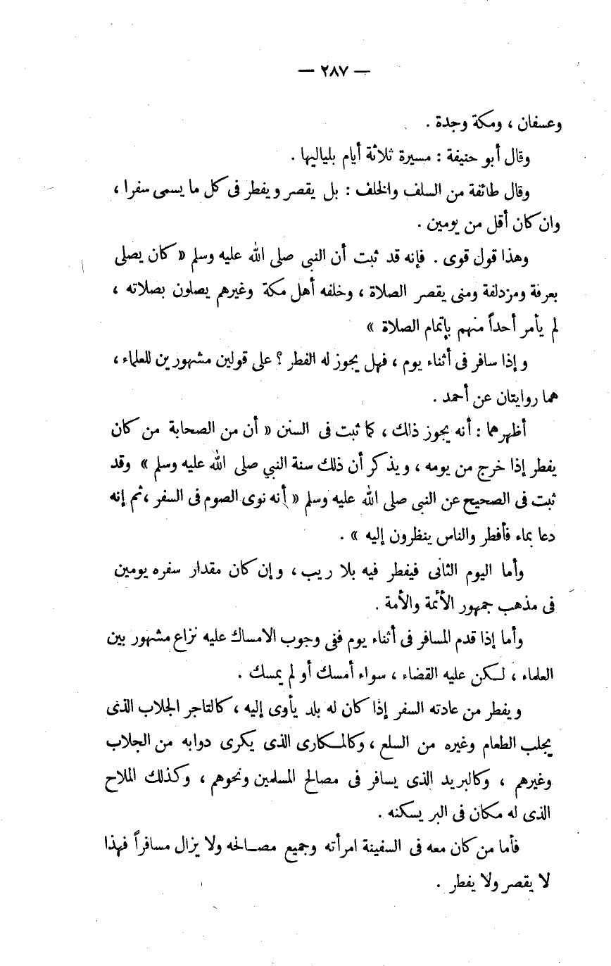 وَإِذا سَافر فِي أثْنَاء يَوْم فَهَل يجوز لَهُ الْفطر على قَوْلَيْنِ مشهورين للْعُلَمَاء هما رِوَايَتَانِ عَن أَحْمد