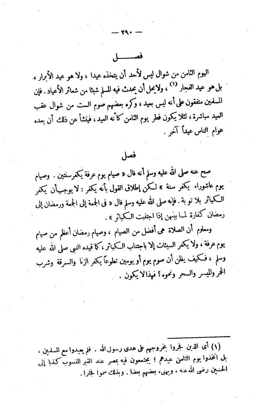الْيَوْم الثَّامِن من شَوَّال لَيْسَ لأحد أَن يَتَّخِذهُ عيدا وَلَا هُوَ عبد الْأَبْرَار بل هُوَ عيد الْفجار وَلَا يحل أَن يحدث فِيهِ الْمُسلم شَيْئا من شَعَائِر الأعياد فَإِن الْمُسلمين متفقون على أَنه لَيْسَ بعيد وَكره بَعضهم صَوْم السِّت من شَوَّال عقب الْعِيد مُبَاشرَة لِئَلَّا يكون فطر يَوْم الثَّامِن كَأَنَّهُ الْعِيد فينشأ عَن ذَلِك أَن بعده عوام النَّاس عيدا آخر