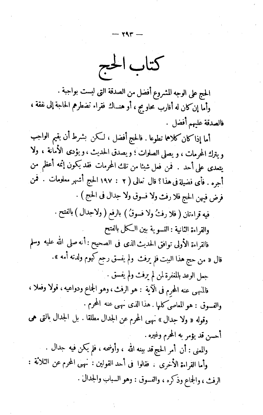 فالقراءة الأولى توَافق الحَدِيث فِي الصَّحِيح أَنه صلى الله عَلَيْهِ وَسلم قَالَ من حج هَذَا الْبَيْت فَلم يرْفث وَلم يفسق رَجَعَ كَيَوْم وَلدته أمه