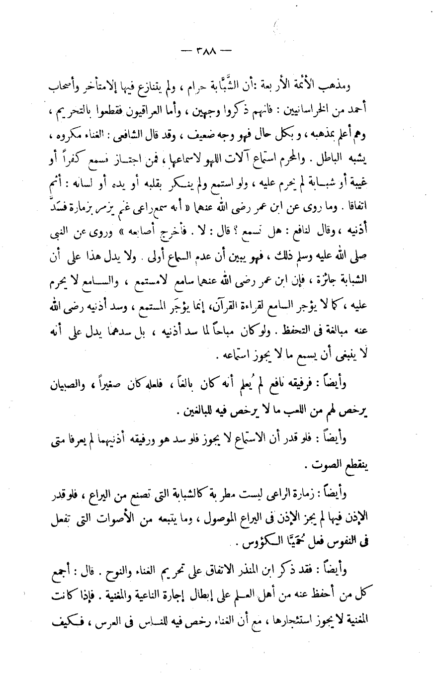 وَمذهب الْأَئِمَّة الْأَرْبَعَة أَن الشبابة حرَام وَلم يتنازع فِيهَا إِلَّا مُتَأَخّر وَأَصْحَاب أَحْمد من الخراسانيين فانهم ذكرُوا وَجْهَيْن وَأما الْعِرَاقِيُّونَ فَقطعُوا بِالتَّحْرِيمِ وهم أعلم بمذهبه وَبِكُل حَال فَهُوَ وَجه ضَعِيف وَقد قَالَ الشَّافِعِي الْغناء مَكْرُوه يشبه الْبَاطِل وَالْمحرم اسْتِمَاع الآت اللَّهْو لاسماعها فَمن اجتاز فَسمع كفرا أوغيبة أَو شَبابَة لم يحرم عَلَيْهِ وَلَو اسْتمع وَلم يُنكر بِقَلْبِه أَو يَده أَو لِسَانه أَثم اتِّفَاقًا وَمَا رُوِيَ عَن ابْن عمر رَضِي الله عَنْهُمَا أَنه سمع راعي غنم يزمر بزمارة فسد أُذُنَيْهِ وَقَالَ لنافع هَل تسمع قَالَ لَا فَأخْرج أَصَابِعه وروى عَن النَّبِي صلى الله عَلَيْهِ وَسلم ذَلِك هُوَ يبين أَن عدم السماع أولى وَلَا يدل هَذَا على أَن الشبابة جَائِزَة فَإِن ابْن عمر رَضِي الله عَنْهُمَا سامع لَا مستمع وَالسَّامِع لَا يحرم عَلَيْهِ كَمَا لَا يُؤجر السَّامع لقِرَاءَة الْقُرْآن إِنَّمَا يُؤجر المستمع وسد أُذُنَيْهِ رَضِي الله عَنهُ مُبَالغَة فِي التحفظ وَلَو كَانَ مُبَاحا لما سد أُذُنَيْهِ بل سدهما يدل على أَنه لَا يَنْبَغِي أَن يسمع مَالا يجوز استماعه