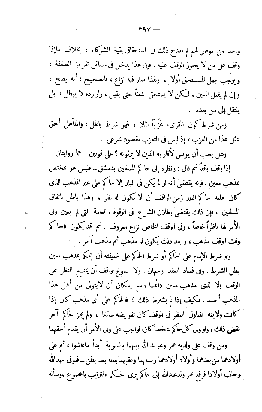 وَهل يجب أَن يُوصي لأقاربه الَّذين لَا يرثونه على قَوْلَيْنِ هما رِوَايَتَانِ بِمذهب معِين فَإِنَّهُ يَقْتَضِي أَنه لَو لم يكن فِي الْبَلَد إِلَّا حَاكم على غير الْمَذْهَب الَّذِي كَانَ عَلَيْهِ حَاكم الْبَلَد زمن الْوَاقِف أَن لَا يكون لَهُ نظر وَهَذَا بَاطِل بِاتِّفَاق الْمُسلمين فَإِن ذَلِك يَقْتَضِي بطلَان الشَّرْع فِي الْوُقُوف الْعَامَّة الَّتِي لم يعين ولي الْأَمر لَهَا نَاظرا خَاصّا وَفِي الْوَقْف الْخَاص نزاع مَعْرُوف ثمَّ قد يكون للْحَاكِم وَقت الْوَقْف مَذْهَب وَبعد ذَلِك يكون لَهُ مَذْهَب ثمَّ مَذْهَب آخر