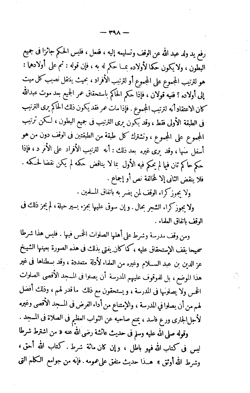 رفع يَدَيْهِ ولد عبد الله عَن الْوَقْف وتسليمه إِلَيْهِ فَفعل فَلَيْسَ الحكم جَائِزا فِي جَمِيع الْبُطُون وَلَا يكون حكما لأولاده بِمَا حكم لَهُ بِهِ فَإِن قَوْله ثمَّ على أولادهما هُوَ لترتيب الْمَجْمُوع على الْمَجْمُوع أَو لترتيب الْأَفْرَاد بِحَيْثُ ينْتَقل نصيب كل ميت إِلَى أَوْلَاده فَفِيهِ قَولَانِ فَإِذا حكم بِاسْتِحْقَاق عمر الْجَمِيع بعد موت عبد الله كَانَ الِاعْتِقَاد أَنه لترتيب الْمَجْمُوع فَإِذا مَاتَ عمر فقد يكون ذَلِك الْحَاكِم يرى التَّرْتِيب فِي الطَّبَقَة الأولى فَقَط وَقد يكون يرى التَّرْتِيب فِي جَمِيع الْبُطُون لَكِن تَرْتِيب الْمَجْمُوع على الْمَجْمُوع وتشترك كل طبقَة من الطبقتين فِي الْوَقْف دون من هُوَ أَسْفَل مِنْهَا وَقد يرى غَيره بعد ذَلِك أَنه لترتيب الْأَفْرَاد على الْأَفْرَاد فَإِذا حكم حَاكم ثَان فِيمَا لم يحكم فِيهِ الأول بِمَا لَا يُنَاقض حكمه لم يكن نقضا لحكمه فَلَا ينْقض الثَّانِي إِلَّا لمُخَالفَة نَص أَو أجماع