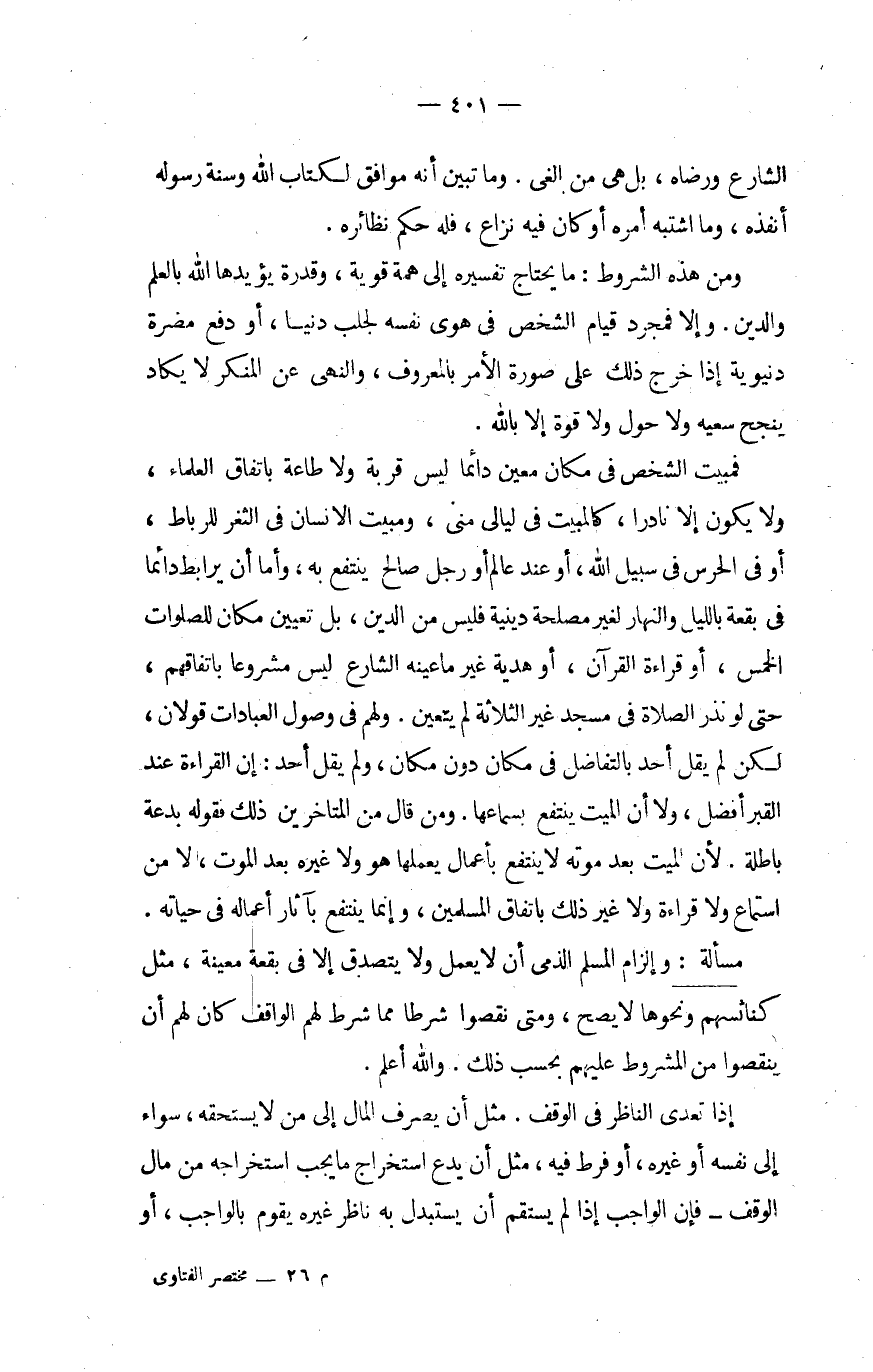 فمبيت الشَّخْص فِي مَكَان معِين دَائِما لَيْسَ قربَة وَلَا طَاعَة بِاتِّفَاق الْعلمَاء وَلَا يكون إِلَّا نَادرا كالمبيت فِي ليَالِي منى ومبيت الانسان فِي الثغر للرباط أَو فِي الحرس فِي سَبِيل الله أَو عِنْد عَالم أَو رجل صَالح ينْتَفع بِهِ وَأما أَن يرابط دَائِما فِي بقْعَة بِاللَّيْلِ وَالنَّهَار لغير مصلحَة دينية فَلَيْسَ من الدّين بل تعْيين مَكَان للصلوات الْخمس أَو قِرَاءَة الْقُرْآن أَو هَدِيَّة غير مَا عينه الشَّارِع لَيْسَ مَشْرُوعا باتفاقهم حَتَّى لَو نذر الصَّلَاة فِي مَسْجِد غير الثَّلَاثَة لم يتَعَيَّن وَلَهُم فِي وُصُول الْعِبَادَات قَولَانِ لَكِن لم يقل أحد بالتفاضل فِي مَكَان دون مَكَان وَلم يقل أحد إِن الْقِرَاءَة عِنْد الْقَبْر أفضل وَلَا أَن الْمَيِّت ينْتَفع بسماعها وَمن قَالَ من الْمُتَأَخِّرين ذَلِك فَقَوله بِدعَة بَاطِلَة لِأَن الْمَيِّت بعد مَوته لَا ينْتَفع بأعمال يعلمهَا هُوَ وَلَا غَيره بعد الْمَوْت لَا من اسْتِمَاع وَلَا قِرَاءَة وَلَا غير ذَلِك بِاتِّفَاق الْمُسلمين وَإِنَّمَا ينْتَفع بآثار أَعماله فِي حَيَاته
