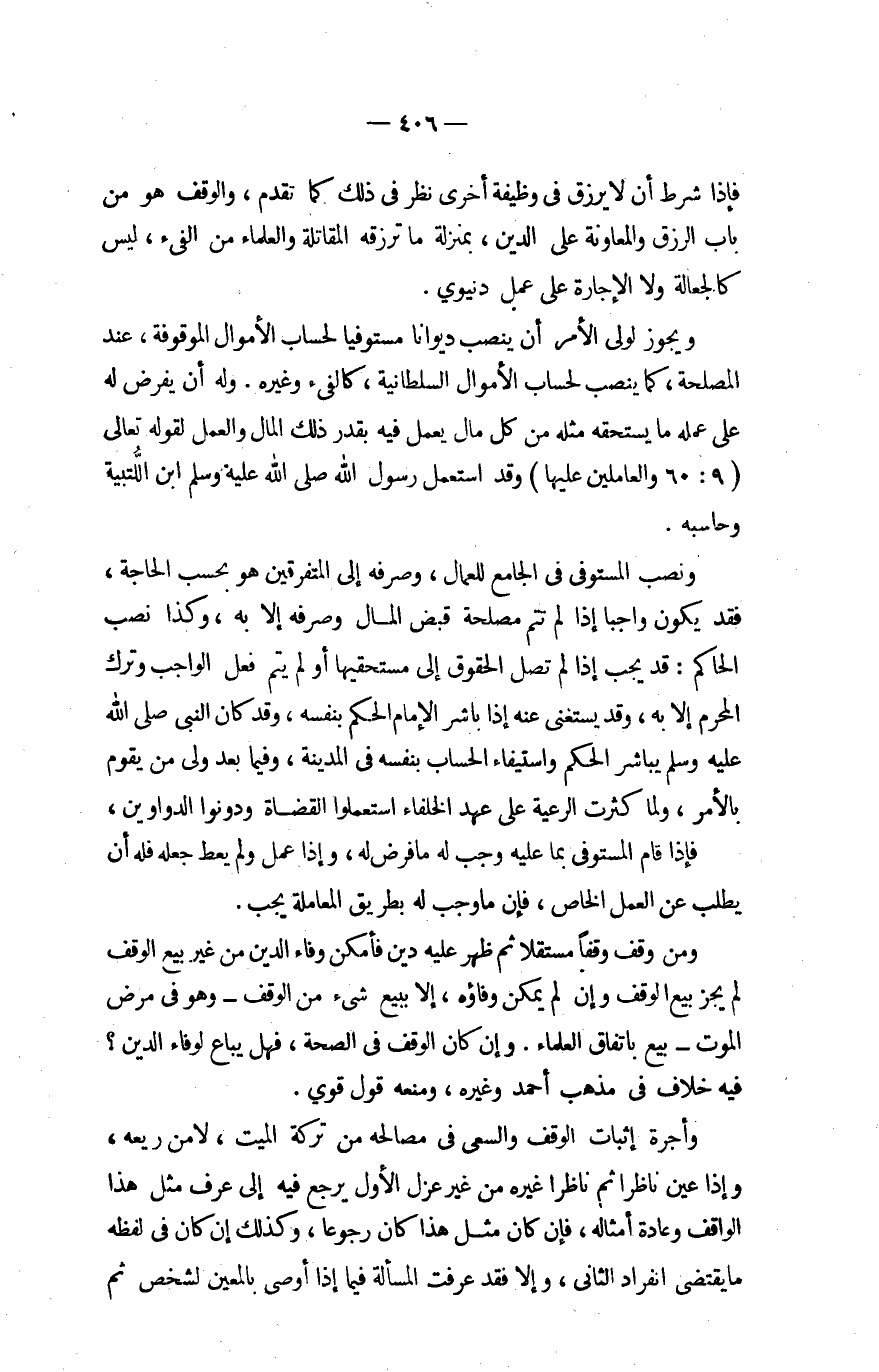 وَيجوز لوَلِيّ الْأَمر أَن ينصب ديوانا مُسْتَوْفيا لحساب الْأَمْوَال الْمَوْقُوفَة عِنْد الْمصلحَة كَمَا ينصب لحساب الْأَمْوَال السُّلْطَانِيَّة كالفيء وَغَيره وَله أَن يفْرض لَهُ على عمله مَا يسْتَحقّهُ مثله من كل مَال يعْمل فِيهِ بِقدر ذَلِك المَال وَالْعَمَل لقَوْله تَعَالَى {والعاملين عَلَيْهَا} وَقد اسْتعْمل رَسُول الله صلى الله عَلَيْهِ وَسلم ابْن اللتبية وحاسبه