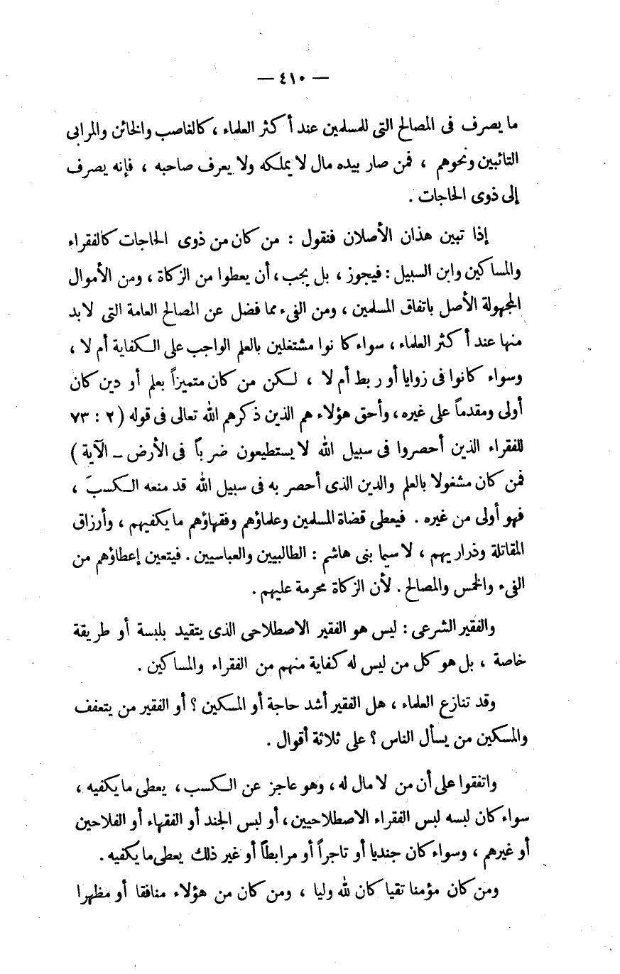 إِذا تبين هَذَانِ الأصلان فَنَقُول من كَانَ من ذَوي الْحَاجَات كالفقراء وَالْمَسَاكِين وَابْن السَّبِيل فَيجوز ب يجب أَن يغطوا من الزَّكَاة وَمن الْأَمْوَال المجهولة الأَصْل بِاتِّفَاق الْمُسلمين وَمن الْفَيْء مِمَّا فضل عَن الْمصَالح الْعَامَّة الَّتِي لَا بُد مِنْهَا عِنْد أَكثر الْعلمَاء سَوَاء كَانُوا مشتغلين بِالْعلمِ الْوَاجِب على الْكِفَايَة أم لَا وَسَوَاء كَانُوا فِي زَوَايَا أَو ربط أم لَا لَكِن من كَانَ متميزا بِعلم أَو دين كَانَ أولى ومقدما على غَيره وأحق هَؤُلَاءِ هم الَّذين ذكرهم الله تَعَالَى فِي قَوْله للْفُقَرَاء الَّذين أحضروا فِي سَبِيل الله لَا يَسْتَطِيعُونَ ضربا فِي الأَرْض الْآيَة فَمن كَانَ مَشْغُولًا بِالْعلمِ ولادين الَّذِي أحْصر بِهِ فِي سَبِيل الله قد مَنعه الْكتب فَهُوَ أولى من غَيره فَيعْطى قُضَاة الْمُسلمين وعلماؤهم وفقهاؤهم مَا يكفيهم وأرزاق الْمُقَاتلَة وذراريهم لَا سِيمَا بني هَاشم الطالبين والعاسيين فَيتَعَيَّن إعطاؤهم من الْفَيْء وَالْخمس والمصالح لِأَن الزَّكَاة مُحرمَة عَلَيْهِم