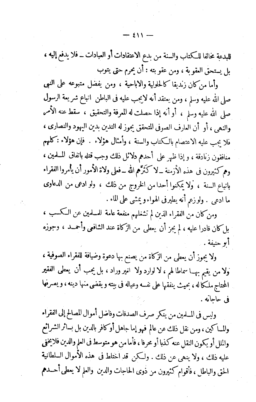 وَلَيْسَ فِي الْمُسلمين من يُنكر صرف الصَّدقَات وفاضل أَمْوَال للصالح إِلَى الْفُقَرَاء وللمساكين وَمن نقل ذَلِك عَن عَالم فَهُوَ إِمَّا جَاهِل أَو كَافِر بِالدّينِ بل بِسَائِر الشَّرَائِع والملل أَو يكون النَّقْل عَنهُ كذبا أَو محرفا فَأَما من هُوَ متوسط فِي الْعلم وَالدّين فَلَا يخفى عَلَيْهِ ذَلِك وَلَا ينْهَى عَن ذَلِك وَلَكِن قد اخْتَلَط فِي هَذِه الْأَمْوَال السُّلْطَانِيَّة الْحق وَالْبَاطِل فأقوام كَثِيرُونَ من ذَوي الْحَاجَات وَالدّين وَالْعلم لَا يعْطى أحدهم
