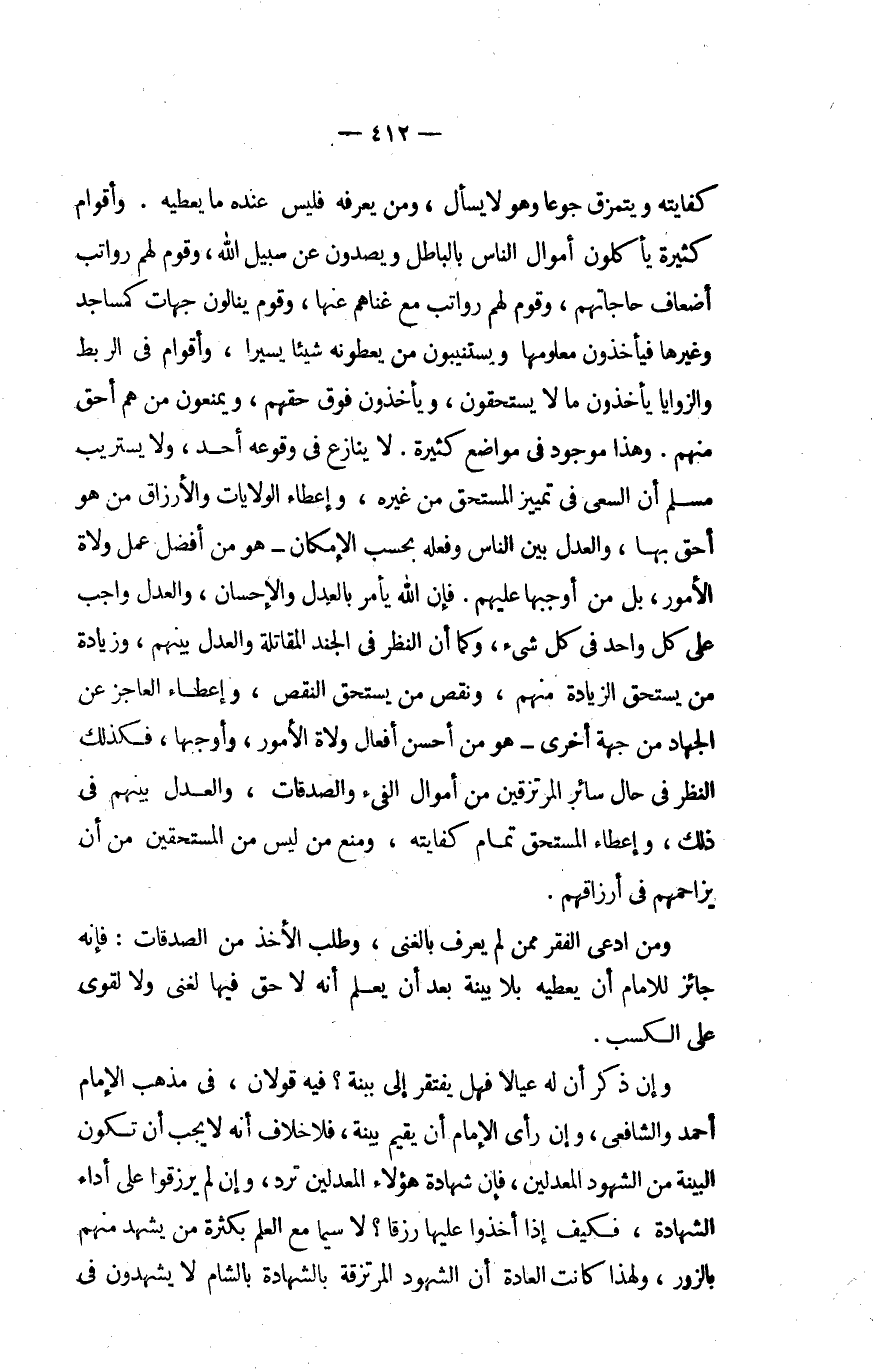 كفاتيه ويتمزق جوعا وَهُوَ لَا يسْأَل وَمن يعرف فَلَيْسَ عِنْده مَا يُعْطِيهِ وأقوام كَثِيرَة يَأْكُلُون أَمْوَال النَّاس ويصدون عَن سَبِيل الله وَقوم لَهُم رواتب أَضْعَاف حاجاتهم وَقوم لَهُم رواتب مَعَ غناهم عَنْهَا وَقوم ينالون جِهَات كمساجد وَغَيرهَا فَيَأْخُذُونَ معلومها ويستنيبون من يطعونه شَيْئا يَسِيرا وأقوام فِي الرَّبْط والزوايا يَأْخُذُونَ مَالا يسْتَحقُّونَ وَيَأْخُذُونَ فَوق حَقهم وَيمْنَعُونَ من هم أَحَق مِنْهُم وَهَذَا مَوْجُود فِي مَوَاضِع كَثِيرَة لَا يُنَازع فِي وُقُوعه أحد وَلَا يستريب مُسلم أَن السَّعْي فِي تَمْيِيز الْمُسْتَحق من غَيره وَإِعْطَاء الولايات والأرزاق من هُوَ أَحَق بهَا وَالْعدْل بَين النَّاس وَفعله بِحَسب الْإِمْكَان هُوَ من أفضل عمل وُلَاة الْأُمُور بل من أوجبهَا عَلَيْهِم فَإِن الله يَأْمر بِالْعَدْلِ وَالْإِحْسَان وَالْعدْل وَاجِب على كل وَاحِد فِي كل شَيْء وَكَانَ أَن النّظر فِي الْجند الْمُقَاتلَة وَالْعدْل بَينهم وَزِيَادَة من يسْتَحق الزِّيَادَة مِنْهُم وَنقص من يسْتَحق النَّقْص وَإِعْطَاء الْعَاجِز عَن الْجِهَاد من جِهَة أُخْرَى هُوَ من أحسن أَفعَال وُلَاة الْأُمُور وأوجبها فَكَذَلِك النّظر فِي حَال سَائِر المرتزقين من أَمْوَال الْفَيْء وَالصَّدقَات وَالْعدْل بَينهم فِي ذَلِك وَإِعْطَاء الْمُسْتَحق تَمام كِفَايَته وَمنع من لَيْسَ من الْمُسْتَحقّين من أَن يزاحمهم فِي أَرْزَاقهم