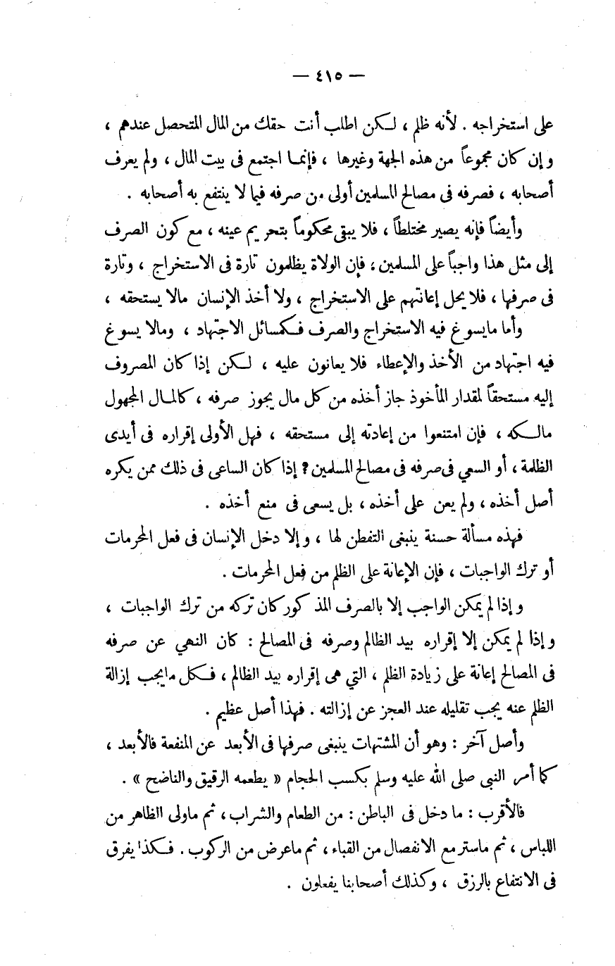 وَإِذا لم يُمكن الْوَاجِب إِلَّا بِالصرْفِ الْمَذْكُور كَانَ تَركه من ترك الْوَاجِبَات وَإِذا لم يُمكن إِلَّا إِقْرَاره بيد الظَّالِم وَصَرفه فِي الْمصَالح كَانَ النَّهْي عَن صرفه فِي الْمصَالح إِعَانَة على زِيَادَة الظُّلم الَّتِي هِيَ إِقْرَاره بيد الظَّالِم فَكل مَا يجب إِزَالَة الظُّلم عَنهُ يجب تقليله عِنْد الْعَجز عَن إِزَالَته فَهَذَا أصل عَظِيم