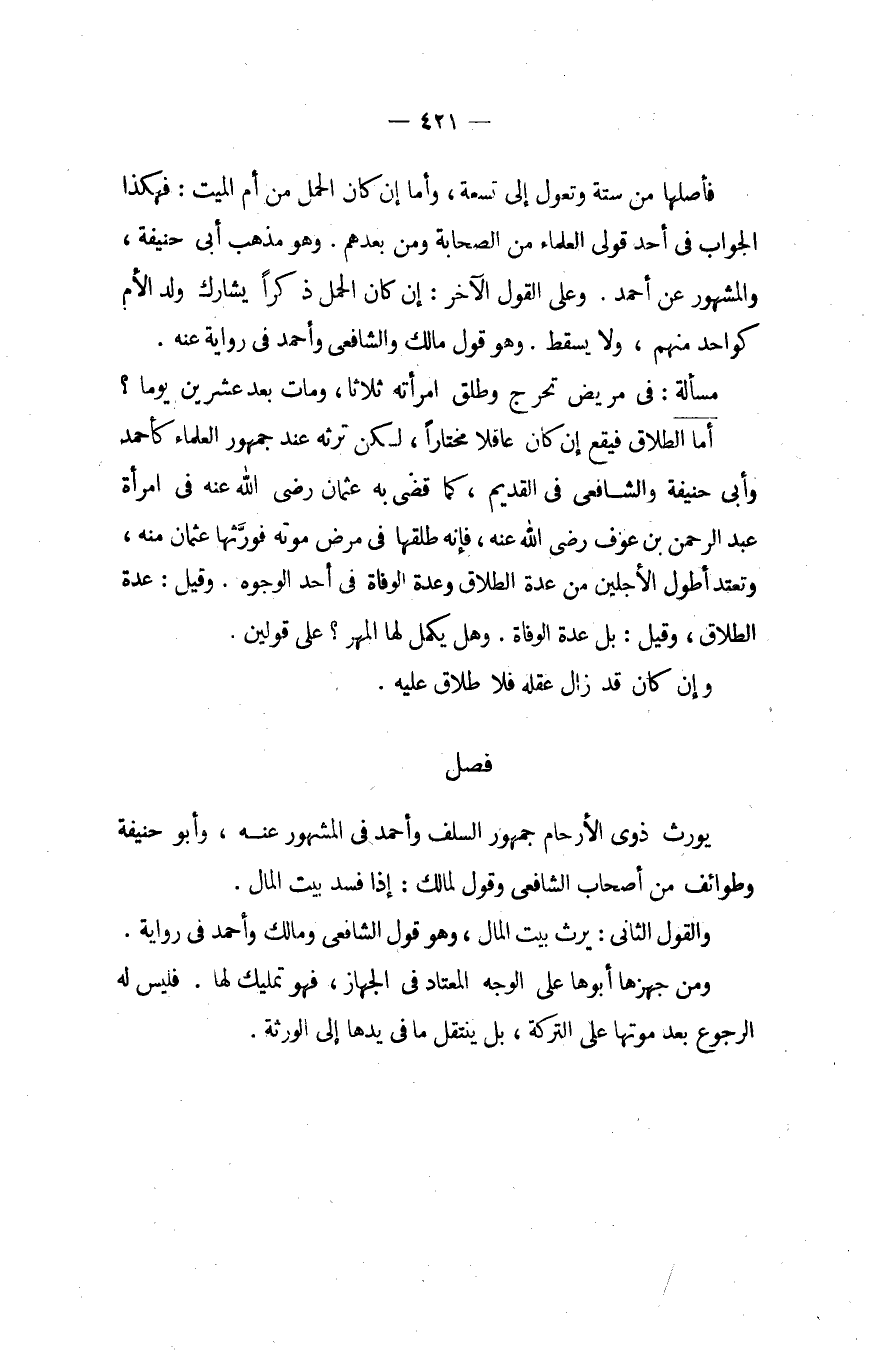 مَسْأَلَة فِي مَرِيض تحرج وطلق امْرَأَته ثَلَاثًا وَمَات بعد عشْرين يَوْمًا أما الطَّلَاق فَيَقَع إِن كَانَ عَاقِلا مُخْتَارًا لَكِن تَرثه عِنْد جُمْهُور الْعلمَاء كأحمد وَأبي حنيفَة وَالشَّافِعِيّ فِي الْقَدِيم كَمَا قضى بِهِ عُثْمَان رَضِي الله عَنهُ فِي امْرَأَة عبد الرَّحْمَن بن عَوْف رَضِي الله عَنهُ فَإِنَّهُ طَلقهَا فِي مرض فَورثَهَا عُثْمَان مِنْهُ وَتعْتَد أطول الْأَجَليْنِ من عدَّة الطَّلَاق وعدة الْوَفَاة فِي أحد الْوُجُوه وَقيل عدَّة الطَّلَاق وَقيل بل عدَّة الْوَفَاة وَهل يكمل لَهَا الْمهْر على قَوْلَيْنِ