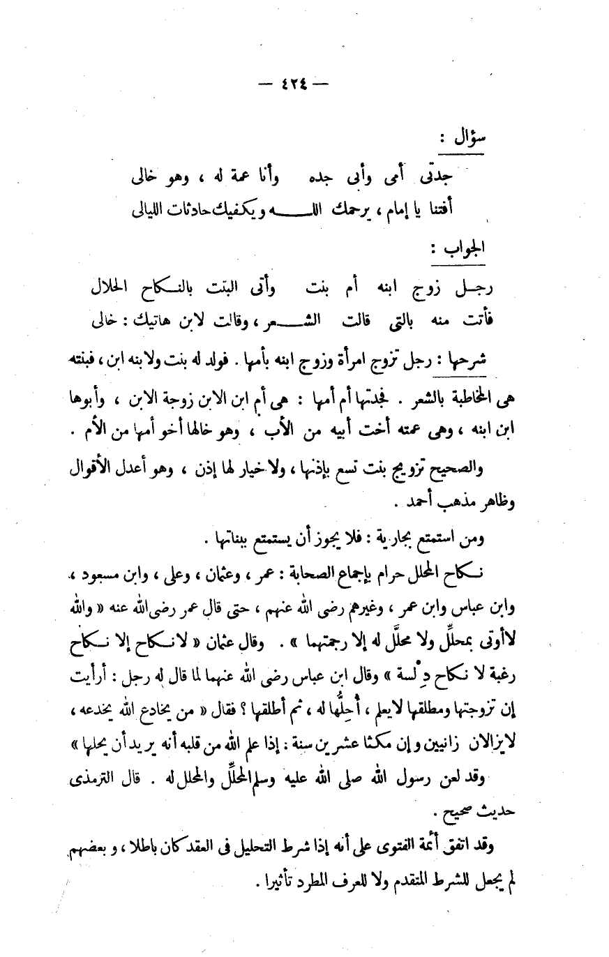 نِكَاح الْمُحَلّل حرَام بِإِجْمَاع الصَّحَابَة عمر وَعُثْمَان وَعلي وَابْن مَسْعُود وَابْن عَبَّاس وَابْن عمر وَغَيرهم رَضِي الله عَنْهُم حَتَّى قَالَ عمر رَضِي الله عَنهُ وَالله لَا أُوتِيَ لمحلل وَلَا مُحَلل لَهُ إِلَّا رَجَمْتهمَا وَقَالَ عُثْمَان لَا نِكَاح إِلَّا نِكَاح رَغْبَة لَا نِكَاح دُلْسَة وَقَالَ ابْن عَبَّاس رَضِي الله عَنْهُمَا لما قَالَ لَهُ رجل أَرَأَيْت إِن تَزَوَّجتهَا ومطلقها لَا يعلم أحلهَا لَهُ ثمَّ أطلقها فَقَالَ من يُخَادع الله يخدعه لَا يزَالَانِ زَانِيَيْنِ وَإِن مكثا عشْرين سنة إِذا علم الله من قبله أَنه يُرِيد أَن يحلهَا وَقد لعن رَسُول الله صلى الله عَلَيْهِ وَسلم الْمُحَلّل والمحلل لَهُ قَالَ التِّرْمِذِيّ حَدِيث صَحِيح