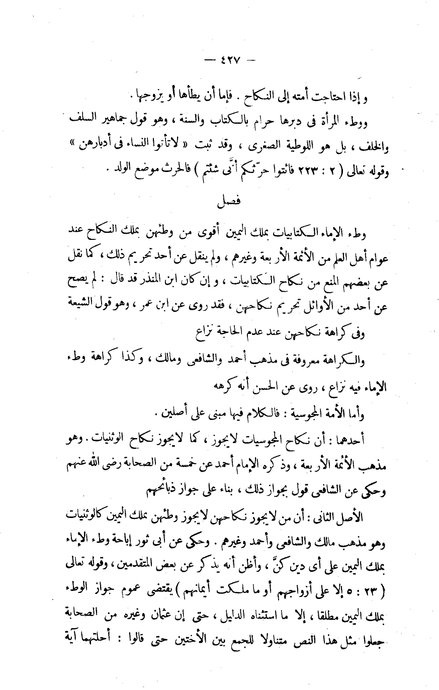 وَأما الْأمة الْمَجُوسِيَّة فَالْكَلَام فِيهَا مَبْنِيّ على أصلين