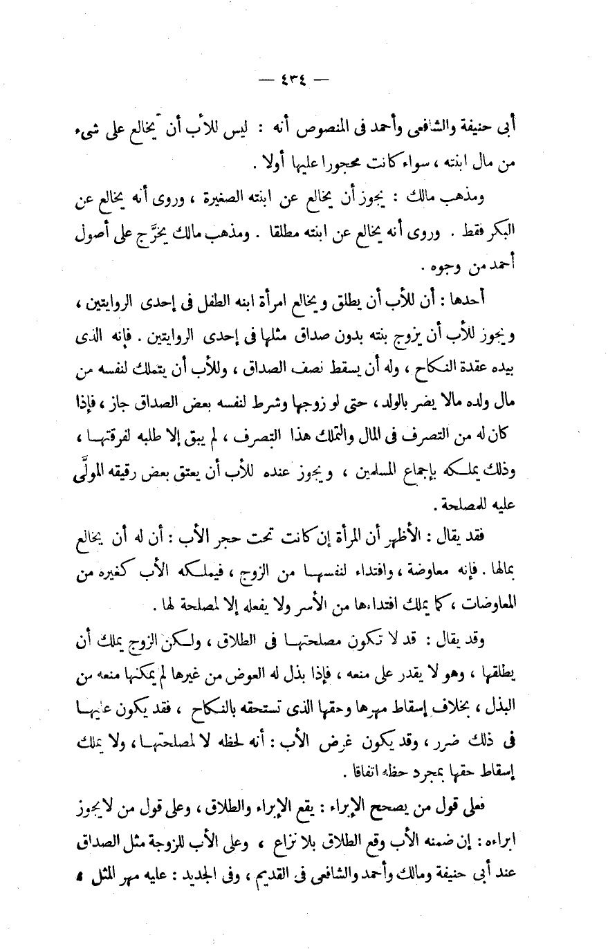 أَحدهَا أَن للْأَب أَن يُطلق ويخالع امْرَأَة ابْنه الطِّفْل فِي إِحْدَى الرِّوَايَتَيْنِ وَيجوز للْأَب أَن يُزَوّج بنته بِدُونِ صدَاق مثلهَا فِي إِحْدَى الرِّوَايَتَيْنِ فَإِنَّهُ الَّذِي بِيَدِهِ عقده النِّكَاح وَله أَن يسْقط نصف الصَدَاق وَللْأَب أَن يتَمَلَّك نَفسه من مَال وَلَده مَالا يضر بِالْوَلَدِ حَتَّى لَو زَوجهَا وَشرط لنَفسِهِ بعض الصَدَاق جَازَ فَإِذا كَانَ لَهُ من التَّصَرُّف فِي المَال والتملك هَذَا التَّصَرُّف لم يبْق إِلَّا طلبه لفرقتها وَذَلِكَ يملكهُ بِإِجْمَاع الْمُسلمين وَيجوز عِنْده للْأَب أَن يعْتق بعض رَقِيقه الْمولى عَلَيْهِ للْمصْلحَة