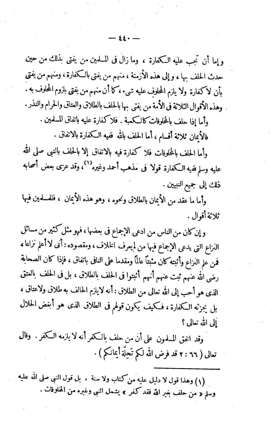 وَإِمَّا أَن تجب عَلَيْهِ الْكَفَّارَة وَمَا زَالَ فِي الْمُسلمين من يُفْتِي بذلك من حِين حدث الْحلف بهَا وَإِلَى هَذِه الْأَزْمِنَة مِنْهُم من يُفْتِي بِالْكَفَّارَةِ وَمِنْهُم من يُفْتِي بِأَن لَا كَفَّارَة وَلَا يلْزم الْمَخْلُوق عَلَيْهِ شَيْء كَمَا أَن مِنْهُم من يُفْتِي بِلُزُوم المخلوف بِهِ وَهَذِه الْأَقْوَال الثَّلَاثَة فِي الْأمة من يُفْتِي بهَا بِالْحلف بِالطَّلَاق وَالْعتاق وَالْحرَام وَالنّذر