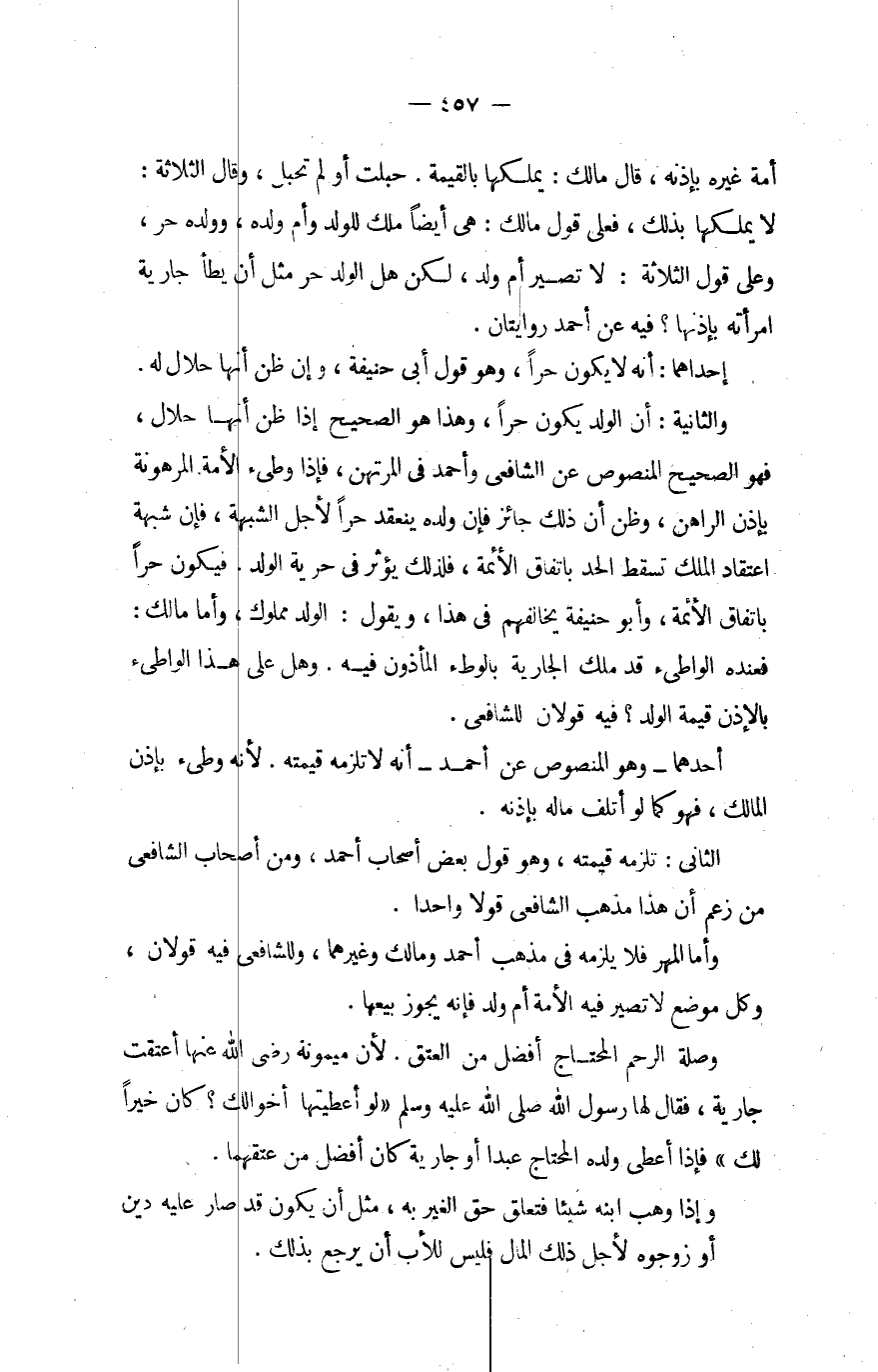 وَالثَّانيَِة أَن الْوَلَد يكون حرا وَهَذَا هُوَ الصَّحِيح إِذا ظن أَنَّهَا حَلَال فَهُوَ الصَّحِيح الْمَنْصُوص عَن الشَّافِعِي وَأحمد فِي الْمُرْتَهن فَإِذا وطىء الْأمة الْمَرْهُونَة بِإِذن الرَّاهِن وَظن أَن ذَلِك جَائِز فَإِن وَلَده ينْعَقد حرا لأجل الشُّبْهَة فَإِن شُبْهَة اعْتِقَاد الْملك تسْقط الْحَد بِاتِّفَاق الْأَئِمَّة فَلذَلِك يُؤثر فِي حريَّة الْوَلَد فَيكون حرا بِاتِّفَاق الْأَئِمَّة وَأَبُو حنيفَة يخالفهم فِي هَذَا وَيَقُول الْوَلَد مَمْلُوك وَأما مَالك فَعنده الوطىء قد ملك الْجَارِيَة بِالْوَطْءِ الْمَأْذُون فِيهِ وَهل على هَذَا الواطىء بِالْإِذْنِ قيمَة الْوَلَد فِيهِ قَولَانِ للشَّافِعِيّ