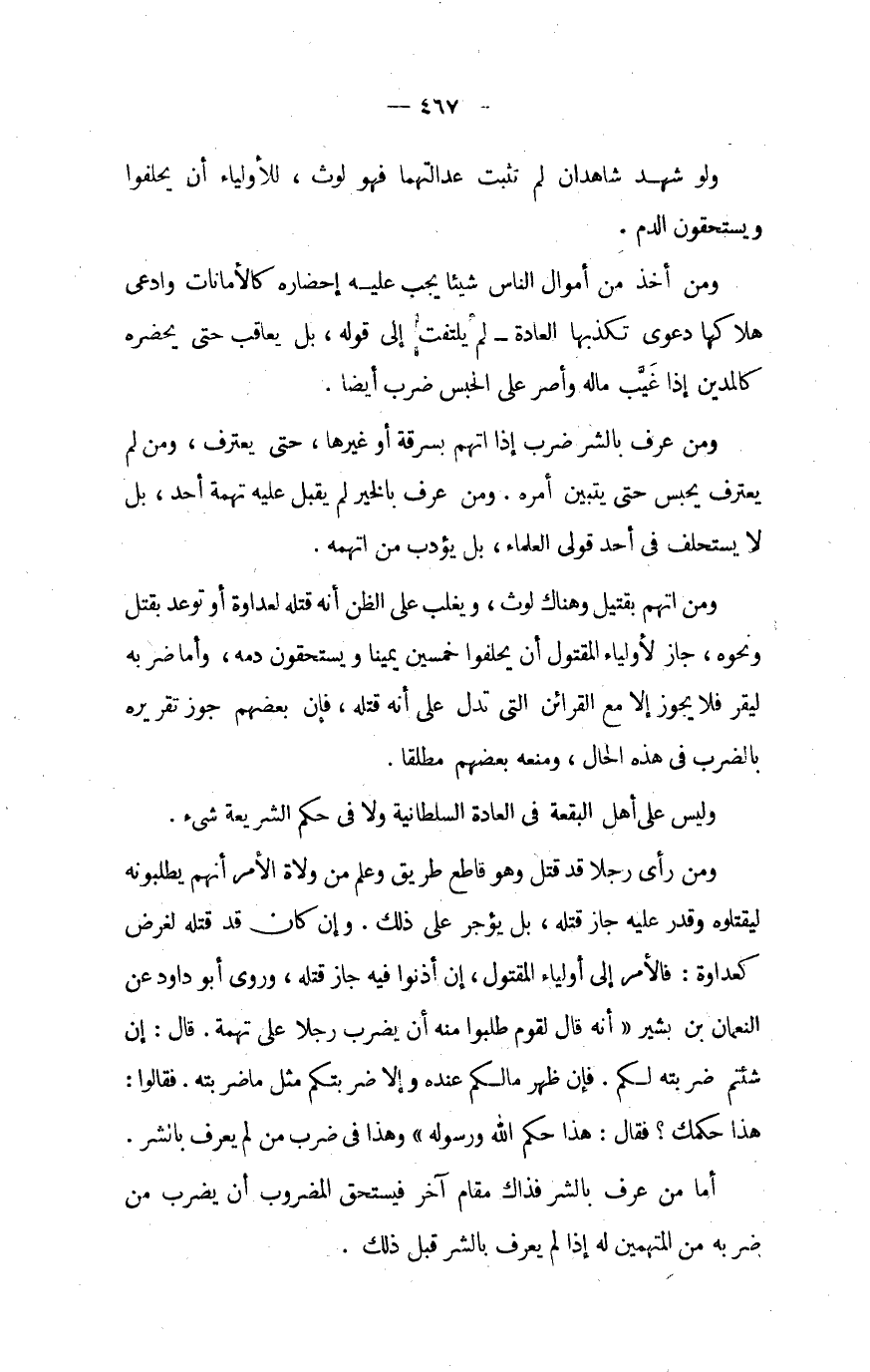 وَمن رأى رجلا قد قتل وَهُوَ قَاطع طَرِيق وَعلم من وُلَاة الْأَمر أَنهم يطلبونه ليقتلوه وَقدر عَلَيْهِ جَازَ قَتله بل يُؤجر على ذَلِك وَإِن كَانَ قد قَتله لغَرَض كعداوة فَالْأَمْر إِلَى أَوْلِيَاء الْمَقْتُول إِن أذنوا فِيهِ جَازَ قَتله وروى أَبُو دَاوُد عَن النُّعْمَان بن بشير أَنه قَالَ لقوم طلبُوا مِنْهُ أَن يضْرب رجلا على تُهْمَة قَالَ إِن شِئْتُم ضَربته لكم فَإِن ظهر مالكم عِنْده وَإِلَّا ضربتكم مثل مَا ضَربته فَقَالُوا هَذَا حكمك فَقَالَ هَذَا حكم الله وَرَسُوله وَهَذَا فِي ضرب من لم يعرف بِالشَّرِّ