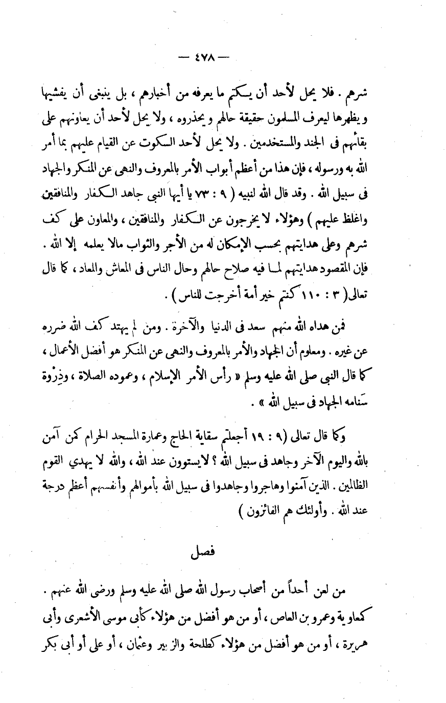 شرهم فَلَا يحل لأحد أَن يكتم مَا يعرفهُ من أخبارهم بل يَنْبَغِي أَن يفشيها ويظهرها ليعرف الْمُسلمُونَ حَقِيقَة حَالهم ويحذروه وَلَا يحل لأحد أَن يعاونهم على بقائهم فِي الْجند والمستخدمين وَلَا يحل لأحد السُّكُوت عَن الْقيام عَلَيْهِم بِمَا أَمر الله بِهِ وَرَسُوله فَإِن هَذَا من أعظم أَبْوَاب الْأَمر بِالْمَعْرُوفِ وَالنَّهْي عَن الْمُنكر وَالْجهَاد فِي سَبِيل الله وَقد قَالَ لنَبيه {يَا أَيهَا النَّبِي جَاهد الْكفَّار وَالْمُنَافِقِينَ وَاغْلُظْ عَلَيْهِم} وَهَؤُلَاء لَا يخرجُون عَن الْكفَّار وَالْمُنَافِقِينَ والمعاون على كف شرهم وعَلى هدايتهم بِحَسب الْإِمْكَان لَهُ من الْأجر وَالثَّوَاب مَالا يُعلمهُ إِلَّا الله فَإِن الْمَقْصُود وهدايتهم لما فِيهِ صَلَاح حَالهم وَحَال النَّاس فِي المعاش والمعاد كَمَا قَالَ تَعَالَى {كُنْتُم خير أمة أخرجت للنَّاس}