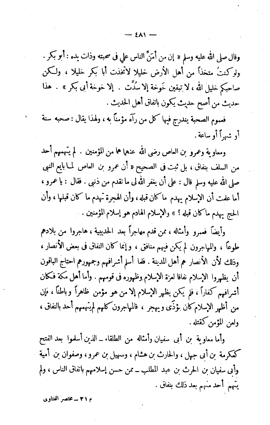 وَمُعَاوِيَة وَعَمْرو بن الْعَاصِ رَضِي الله عَنْهُمَا هما من الْمُؤمنِينَ لم يتهم أحد من السّلف بِنفَاق بل ثَبت فِي الصَّحِيح أَن عَمْرو بن الْعَاصِ لما بَايع النَّبِي صلى الله عَلَيْهِ وَسلم قَالَ على أَن يفغر الله لي مَا تقدم من ذَنبي فَقَالَ يَا عَمْرو أما علمت أَن الْإِسْلَام يهدم مَا كَانَ قبله وَأَن الْهِجْرَة تهدم مَا كَانَ قبلهَا وَأَن الْحَج يهدم مَا كَانَ قبله وَالْإِسْلَام الهادم هُوَ إِسْلَام الْمُؤمنِينَ