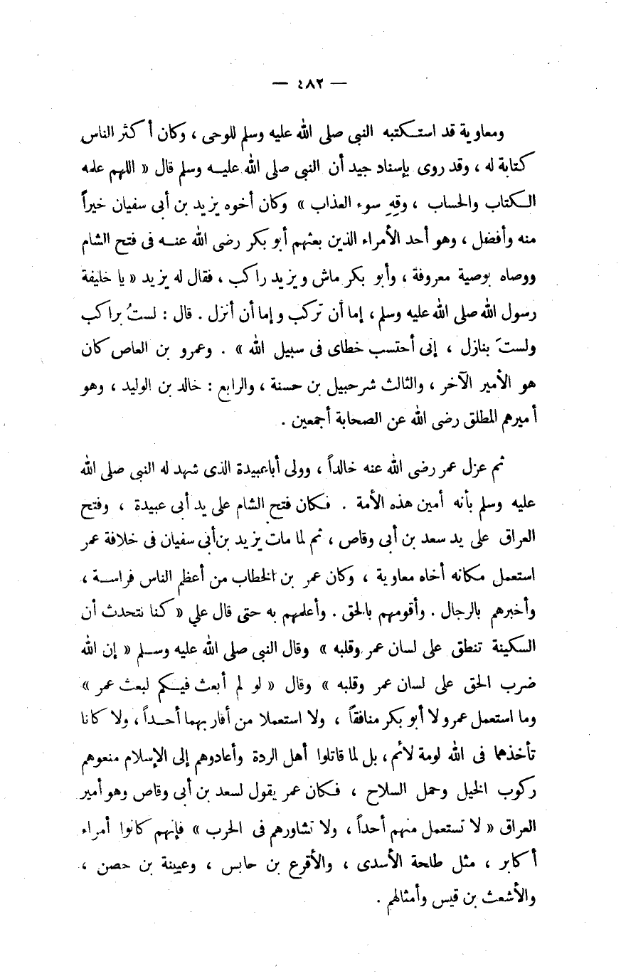 وَمُعَاوِيَة قد اسْتَكْتَبَهُ النَّبِي صلى الله عَلَيْهِ وَسلم للوحي وَكَانَ أَكثر النَّاس كِتَابَة لَهُ وَقد روى بِإِسْنَاد جيد أَن النَّبِي وَقَالَ صلى الله عَلَيْهِ وَسلم قَالَ اللَّهُمَّ علمه الْكتاب والحساب وقه سوء الْعَذَاب وَكَانَ أَخُوهُ يزِيد بن أبي سُفْيَان خيرا مِنْهُ وَأفضل وَهُوَ أحد الْأُمَرَاء الَّذين بَعثهمْ أَبُو بكر رَضِي الله عَنهُ فِي فتح الشَّام ووصاه بِوَصِيَّة مَعْرُوفَة وَأَبُو بكر ماش وَيزِيد رَاكب فَقَالَ لَهُ يزِيد يَا خَليفَة رَسُول الله وَقَالَ صلى الله عَلَيْهِ وَسلم إِمَّا أَن تركب وَإِمَّا أَن أنزل قَالَ لست بِرَاكِب وَلست بنازل إِنِّي أحتسب خطاي فِي سَبِيل الله وَعَمْرو بن الْعَاصِ كَانَ هُوَ الْأَمِير الآخر وَالثَّالِث شُرَحْبِيل بن حَسَنَة وَالرَّابِع خَالِد بن الْوَلِيد وَهُوَ أَمِيرهمْ الْمُطلق رَضِي الله عَن الصَّحَابَة أَجْمَعِينَ