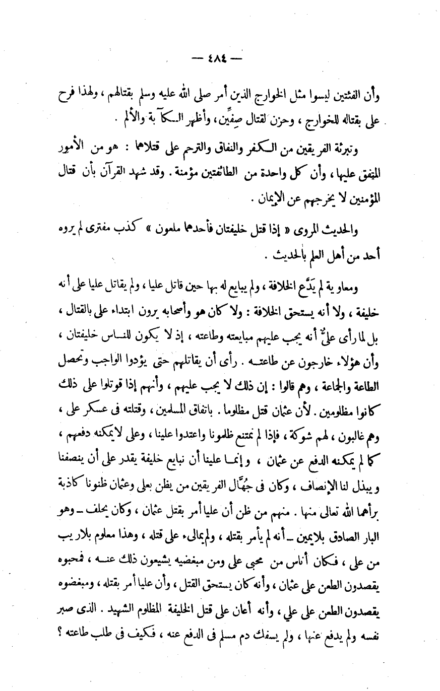 وَمُعَاوِيَة لم يدع الْخلَافَة وَلم يُبَايع لَهُ بهَا حِين قَاتل عليا وَلم يُقَاتل علينا على أَنه خَليفَة وَلَا أَنه يسْتَحق الْخلَافَة وَلَا كَانَ هُوَ وَأَصْحَابه يرَوْنَ ابْتِدَاء على الْقِتَال بل لما رأى على أَنه يجب عَلَيْهِم مبايعته وطاعته إِذا لَا يكون للنَّاس خليفتان وَأَن هَؤُلَاءِ خارجون عَن طَاعَته رأى أَن يقاتلهم حَتَّى يؤدوا الْوَاجِب وَتحصل الطَّاعَة وَالْجَمَاعَة وهم قَالُوا إِن ذَلِك لَا يجب عَلَيْهِم وَأَنَّهُمْ إِذا قوتلوا على ذَلِك كَانُوا مظلومين لِأَن عُثْمَان قتل مَظْلُوما بِاتِّفَاق الْمُسلمين وقتلته فِي عَسْكَر عَليّ وهم غالبون لَهُم شَوْكَة فَإِذا لم نمتنع ظلمونا واعتدوا علينا وعَلى لَا يُمكنهُ دفعهم كَمَا لَا يُمكنهُ الدّفع عَن عُثْمَان وَإِنَّمَا علينا أَن نُبَايِع خَليفَة يقدر على أَن ينصفنا ويبذل لنا الْإِنْصَاف وَكَانَ فِي جهال الْفَرِيقَيْنِ من يظنّ بعلي وَعُثْمَان ظنونا كَاذِبَة برأهما الله تَعَالَى مِنْهَا مِنْهُم من ظن أَن عليا أَمر بقتل عُثْمَان وَكَانَ يحلف وَهُوَ الْبَار الصَّادِق بِلَا يَمِين أَنه لم يَأْمر بقتْله وَلم يمالىء على قَتله وَهَذَا مَعْلُوم بِلَا ريب من على فَكَانَ أنَاس من محبي عَليّ وَمن مبغضيه يشيعون ذَلِك عَنهُ فمحبوه يقصدون الطعْن على عُثْمَان وَأَنه كَانَ يسْتَحق الْقَتْل وَأَن عليا أَمر بقتْله ومبغضوه يقصدون الطعْن على عَليّ وَأَنه أعَان على قتل الْخَلِيفَة الْمَظْلُوم الشَّهِيد الَّذِي صَبر نَفسه وَلم يدْفع عَنْهَا وَلم يسفك دم مُسلم فِي الدّفع عَنهُ فَكيف فِي طلب طَاعَته