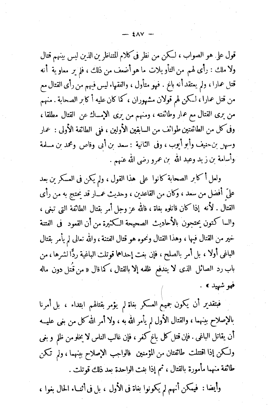 وَلَعَلَّ أكَابِر الصَّحَابَة كَانُوا على هَذَا القَوْل وَلم يكن فِي العسكرين بعد عَليّ أفضل من سعد وَكَانَ من القاعدين وَحَدِيث عمار قد يحْتَج بِهِ من رأى الْقِتَال لِأَنَّهُ إِذا كَانَ قَاتلُوهُ بغاة فَالله عز وَجل أَمر بِقِتَال الطَّائِفَة الَّتِي تبغي والساكتون يحتجون بالأحاديث الصَّحِيحَة الْكَثِيرَة من أَن الْقعُود فِي الْفِتْنَة خير من الْقِتَال فِيهَا وَهَذَا الْقِتَال وَنَحْوه هُوَ قتال الْفِتْنَة وَالله تَعَالَى لم يَأْمر بِقِتَال الْبَاغِي أَولا بل أَمر بِالصُّلْحِ فَإِن بغث إِحْدَاهمَا قوتلت الباغية ردا لشرها من بَاب رد الصَّائِل الَّذِي لَا ينْدَفع ظلمه إِلَّا بِالْقِتَالِ كَمَا قَالَ من قتل دون مَاله فَهُوَ شَهِيد