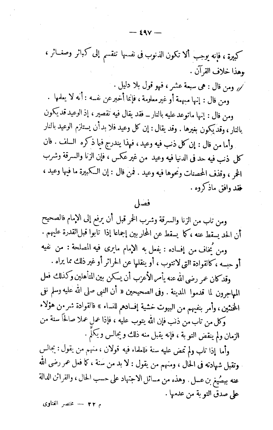 وَأما من قَالَ إِن كل ذَنْب فِيهِ وَعِيد فَهَذَا ينْدَرج فِيمَا ذكره السّلف فان كل ذَنْب فِيهِ حد فِي الدِّينَا فِيهِ وَعِيد من غير عكس فَإِن الزِّنَا وَالسَّرِقَة وَشرب الْخمر وَقذف الْمُحْصنَات وَنَحْوهَا فِيهِ الْوَعيد فَمن قَالَ إِن الْكَبِيرَة مَا فِيهَا وَعِيد فقد وَافق مَا ذَكرُوهُ