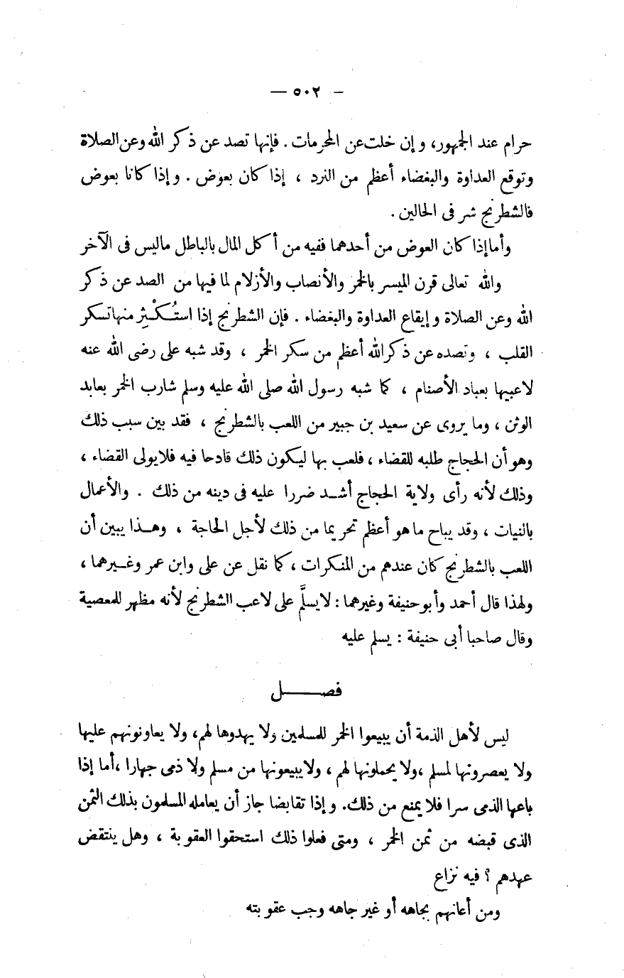 وَأما إِذا كَانَ الْعِوَض من أَحدهمَا فَفِيهِ من أكل المَال بِالْبَاطِلِ مَا لَيْسَ فِي الآخر وَالله تَعَالَى قرن الميسر بِالْخمرِ والأنصاب والأزلام لما فِيهَا من الصد عَن ذكر الله وَعَن الصَّلَاة وإيقاع المداوة والبغضاء فَإِن الشطرنج إِذا استكثر مِنْهَا تسكر الْقلب وتصده عَن ذكر الله أعظم من سكر الْخمر وَقد شبه عَليّ رَضِي الله عَنهُ لاعبيها بعباد الْأَصْنَام كَمَا شبه رَسُول الله صلى الله عَلَيْهِ وَسلم شَارِب الْخمر بعابد الوثن وَمَا يرْوى عَن سعيد بن جُبَير من اللّعب بالشطرنج فقد بَين سَبَب ذَلِك وَهُوَ أَن الْحَاج طلبه للْقَضَاء فلعب بهَا ليَكُون ذَلِك قادحا فِيهِ فَلَا يُولى الْقَضَاء وَذَلِكَ لِأَنَّهُ رأى ولَايَة الْحجَّاج أَشد ضَرَرا عَلَيْهِ فِي دينه من ذَلِك والأعمال بِالنِّيَّاتِ وَقد يُبَاح مَا هُوَ أعطم تَحْرِيمًا من ذَلِك لأجل الْحَاجة وَهَذَا بَين أَن اللّعب بالشطرنج كَانَ عِنْدهم من الْمُنْكَرَات كَمَا نقل عَن عَليّ وَابْن عمر وَغَيرهمَا وَلِهَذَا قَالَ أَحْمد وَأَبُو حنيفَة وَغَيرهمَا لَا يسلم على لاعب الشطرنج لِأَنَّهُ مظهر للمعصية وَقَالَ صاحبا أبي حنيفَة يسلم عَلَيْهِ