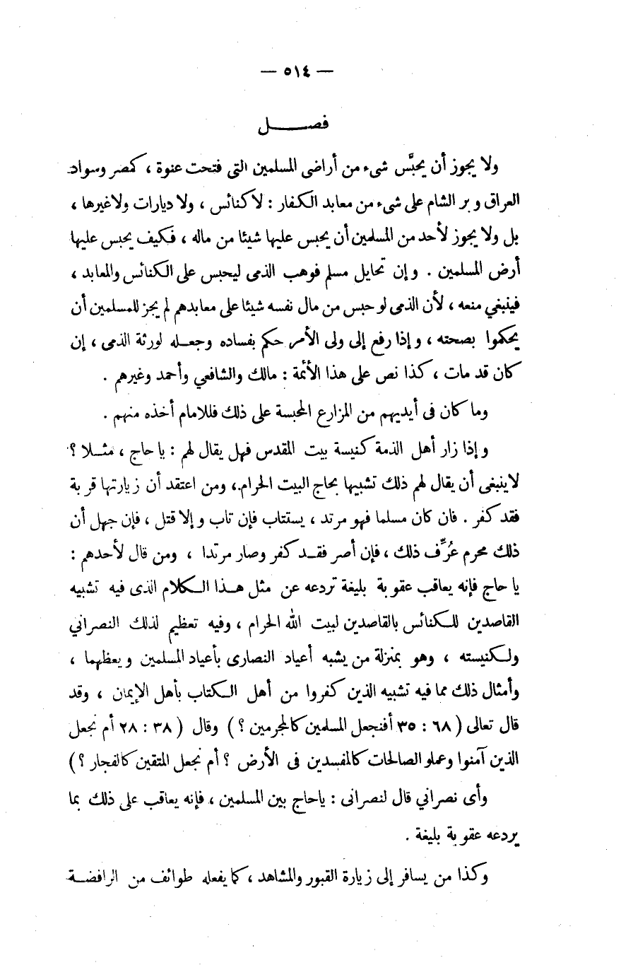 وَإِذا زار أهل الذِّمَّة كَنِيسَة بَيت الْمُقَدّس فَهَل يُقَال لَهُم يَا حَاج مثلا لَا يَنْبَغِي أَن يُقَال لَهُم ذَلِك تَشْبِيها بحاج الْبَيْت الْحَرَام وَمن اعْتقد أَن زيارتها قربَة فقد كفر فان كَانَ مُسلما فَهُوَ مُرْتَد يُسْتَتَاب فَإِن تَابَ وَإِلَّا قتل فَإِن جهل أَن ذَلِك محرم عرف ذَلِك فَإِن أصر فقد كفر وَصَارَ مُرْتَد وَمن قَالَ لأَحَدهم يَا حَاج فَإِنَّهُ يعقب عُقُوبَة بليغة تزدعه عَن مثل هَذَا الْكَلَام الَّذِي فِيهِ تَشْبِيه القاصدين للكنائس بالقاصدين لبيت الله الْحَرَام وَفِيه تَعْظِيم لذَلِك النَّصْرَانِي ولكنيسته وَهُوَ بِمَنْزِلَة من يشبه النَّصَارَى بأعياد الْمُسلمين ويعظهما وأمثال ذَلِك مِمَّا فِيهِ تَشْبِيه الَّذين كفرُوا من أهل الْكتاب بِأَهْل الْإِيمَان وَقد قَالَ تَعَالَى {أفنجعل الْمُسلمين كالمجرمين} وَقَالَ {أم نجْعَل الَّذين آمنُوا وَعمِلُوا الصَّالِحَات كالمفسدين فِي الأَرْض أم نجْعَل الْمُتَّقِينَ كالفجار} وأى نَصْرَانِيّ قَالَ لنصراني يَا حَاج بَين الْمُسلمين فَإِنَّهُ يُعَاقب على ذَلِك بِمَا يزدعه عُقُوبَة بليغة