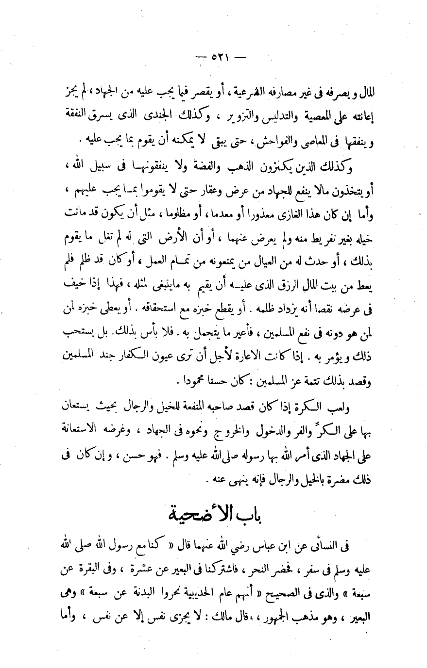 وَكَذَلِكَ الَّذين يكنزون الذَّهَب وَالْفِضَّة وَلَا يُنْفِقُونَهَا فِي سَبِيل الله أَو يتخذون مَالا ينْتَفع للْجِهَاد من عرض وعقار حَتَّى لَا يقومُوا بِمَا يجب عَلَيْهِم وَأما إِن كَانَ هَذَا الْغَازِي مَعْذُور أَو معدما أَو مَظْلُوما مثل أَن يكون قد مَاتَت خيله بِغَيْر تَفْرِيط مِنْهُ وَلم يعرض عَنْهُمَا أوأن الأَرْض الَّتِي لَهُ لم تقل مَا يقوم بذلك أَو حدث لَهُ من الْعِيَال من يمنعونه من تَمام الْعَمَل أَو كَانَ قد طلم فَلم يُعْط من بَيت المَال الرزق عَلَيْهِ أَن يُقيم بِهِ مَا يَنْبَغِي لمثله فَهَذَا إِذا خيف فِي عرضه نقصا أَنه يزْدَاد ظلمه أَو يقطع خبزه مَعَ اسْتِحْقَاقه أَو يعْطى خبزه لن لمن هُوَ دونه فِي نفع الْمُسلمين فَعير مَا يتَحَمَّل بِهِ فَلَا بَأْس بذلك بل يسْتَحبّ ذَلِك وَيُؤمر بِهِ إِذا كَانَت الاعارة لأجل أَن نرى عُيُون الْكفَّار جند الْمُسلمين وَقصد بذلك تَتِمَّة عز الْمُسلمين كَانَ حسنا مَحْمُودًا