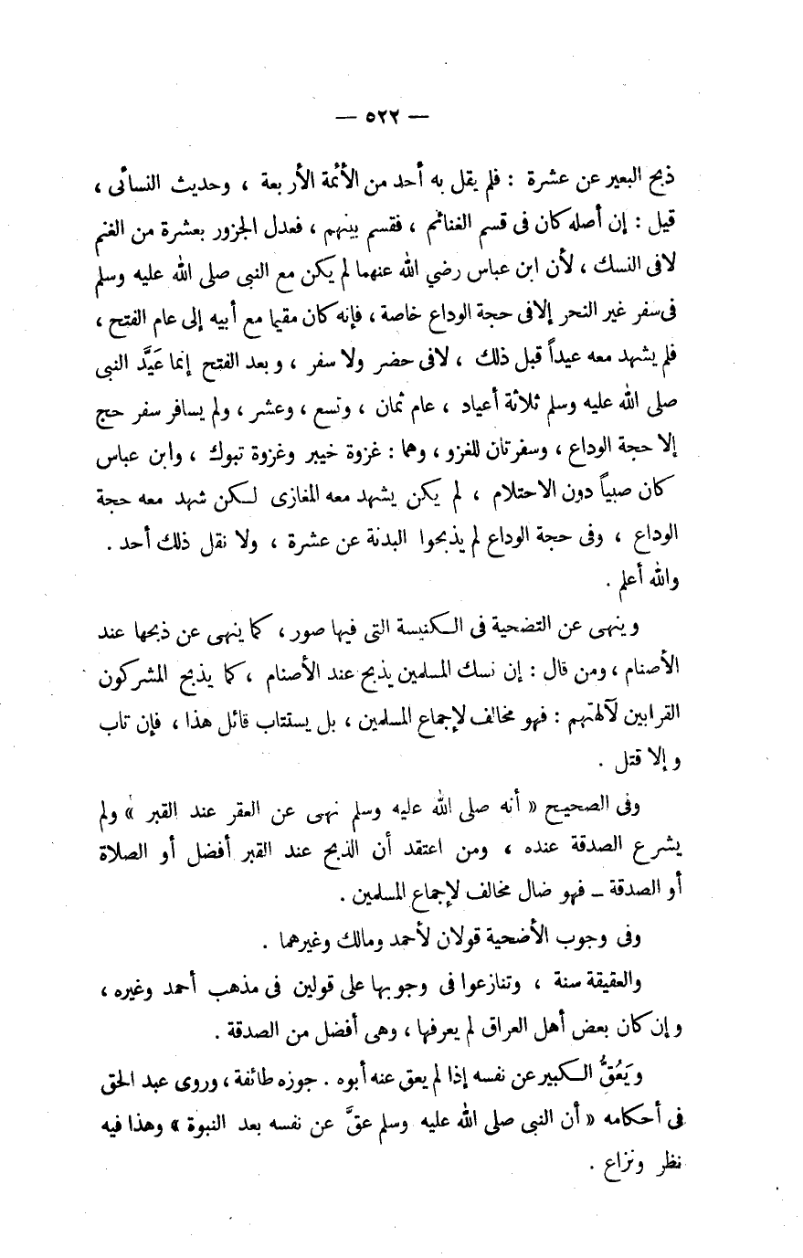 ذبح الْبَعِير عَن عشرَة فَلم يقل بِهِ أحد من الْأَئِمَّة الْأَرْبَعَة وَحَدِيث النَّسَائِيّ قيل إِن أَصله كَانَ فِي قسم الْغَنَائِم فقسم بَينهم فَعدل الْجَزُور بِعشْرَة من الْغنم لَا فِي النّسك لِأَن ابْن عَبَّاس رَضِي الله عَنْهُمَا لم يكن مَعَ النَّبِي صلى الله عَلَيْهِ وَسلم فِي سفر غير النَّحْر إِلَّا فِي حجَّة الْوَدَاع خَاصَّة فَإِنَّهُ كَانَ مُقيما مَعَ أَبِيه إِلَى عَام الْفَتْح فَلم يشْهد مَعَه عيدا قبل ذَلِك لَا فِي حضر وَلَا سفر وَبعد الْفَتْح إِنَّمَا عيد النَّبِي صلى الله عَلَيْهِ وَسلم ثَلَاثَة أعياد عَام ثَمَان وتسع وَعشر وَلم يُسَافر سفر الْحَج إِلَّا حجَّة الْوَدَاع وسفرتان للغزو وهما غَزْوَة خَيْبَر وغزوة تَبُوك وَابْن عَبَّاس كَانَ صَبيا دون الِاحْتِلَام لم يكن يشْهد مَعَه الْمَغَازِي لَكِن شهد مَعَه حجَّة الْوَدَاع وَفِي حجَّة الْوَدَاع لم يذبحوا الْبَدنَة عَن عشرَة وَلَا نقل ذَلِك أحد وَالله أعلم