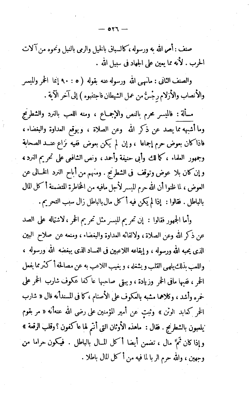 وَأما الْجُمْهُور إِن تَحْرِيم الميسر تَحْرِيم الْخمر لاشْتِمَاله على الصد عَن ذكر الله وَعَن الصَّلَاة ولالقائه الْعَدَاوَة والبغضاء وَمنعه عَن صَلَاح الْبَين الَّذِي يُحِبهُ الله وَرَسُوله وإيقاعه اللاعبين فِي الْفساد الَّذِي ببغضه الله وَرَسُوله واللعب بذلك يلهي الْقلب ويشغله ويغيب اللاعب بِهِ عَن مَصَالِحه أَكثر مِمَّا يفعل الْخمر فَفِيهَا مَا فِي الْخمر وَزِيَادَة وَيبقى صَاحبهَا عاكفا عكوف شَارِب الْخمر على خمرة وَأَشد وَكِلَاهُمَا مشبه بالعكوف على الْأَصْنَام كَمَا فِي الْمسند أَنه قَالَ شَارِب الْخمر كعابد الوثن وَثَبت عَن أَمِير الْمُؤمنِينَ عَليّ رَضِي الله عَنهُ أَنه مر بِقوم يَلْعَبُونَ الشطرنج فَقَالَ مَا هَذِه الْأَوْثَان الَّتِي أَنْتُم لَهَا عاكفون وقلب الرقعة وَإِذا كَانَ ثمَّ مَال تضمن أَيْضا أكل المَال بِالْبَاطِلِ فَيكون حَرَامًا من وَجْهَيْن وَالله حرم الرِّبَا لما فِيهِ من أكل المَال بَاطِلا