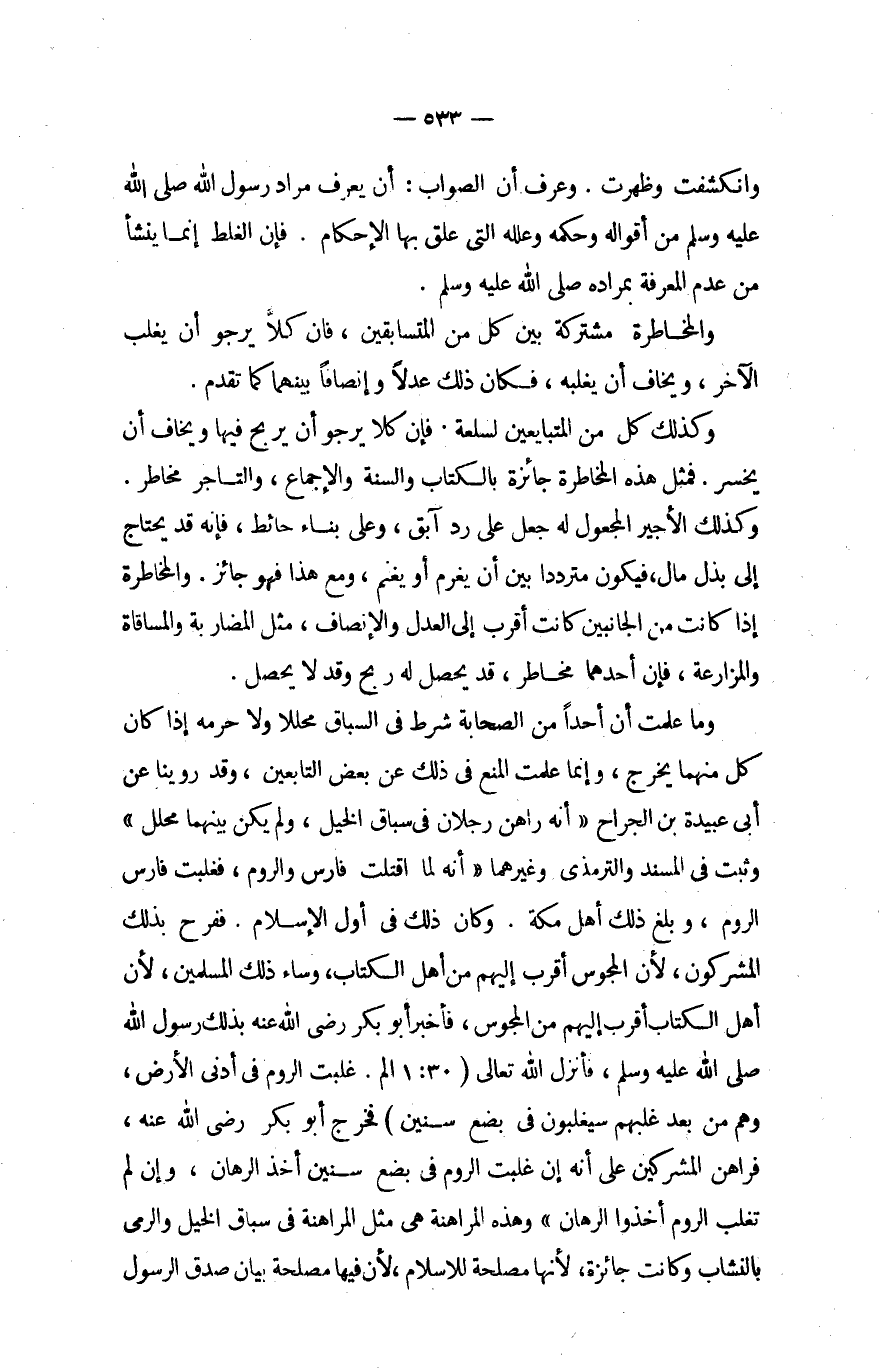 وَمَا علمت أَن أحدا من الصَّحَابَة شَرط فِي السباق محللا وَلَا حُرْمَة إِذا كَانَ كل مِنْهُمَا يخرج وَإِنَّمَا علمت الْمَنْع فِي ذَلِك عَن بعض التَّابِعين وَقد روينَا عَن أبي عُبَيْدَة بن الْجراح أَنه رَاهن رجلَانِ فِي سباق الْخَيل وَلم يكن بَينهمَا مُحَلل وَثَبت فِي الْمسند وَالتِّرْمِذِيّ وَغَيرهمَا أَنه لما اقتلت فَارس وَالروم فَغلبَتْ فَارس الرّوم وَبلغ ذَلِك أهل مَكَّة وَكَانَ ذَلِك فِي أول الْإِسْلَام ففرح بذلك الْمُشْركُونَ لِأَن الْمَجُوس أقرب إِلَيْهِم من أهل الْكتاب وساء ذَلِك الْمُسلمين لِأَن أهل الْكتاب أقرب إِلَيْهِم من الْمَجُوس فَأخْبر أَبُو بكر رَضِي الله عَنهُ بذلك رَسُول الله صلى الله عَلَيْهِ وَسلم فَأنْزل الله تَعَالَى {الم غلبت الرّوم فِي أدنى الأَرْض وهم من بعد غلبهم سيغلبون فِي بضع سِنِين} فَخرج أَبُو بكر رَضِي الله عَنهُ فراهن الْمُشْركين على أَنه إِن غلبت الرّوم فِي بضع سِنِين أَخذ الرِّهَان وَإِن لم تغلب الرّوم أخذُوا الرِّهَان وَهَذِه الْمُرَاهنَة هِيَ مثل الْمُرَاهنَة فِي سباق الْخَيل وَالرَّمْي بالنشاب وَكَانَت جَائِزَة لِأَنَّهَا مصلحَة للاسلام لِأَن فِيهَا مصلحَة بَيَان صدق الرَّسُول