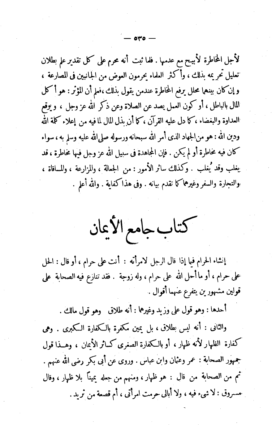 وَالثَّانِي أَنه لَيْسَ بِطَلَاق بل يَمِين مكفرة الْكُبْرَى وَهِي كَفَّارَة الظِّهَار لِأَنَّهُ ظِهَار أَو بِالْكَفَّارَةِ الصُّغْرَى كَسَائِر الْأَيْمَان وَهَذَا قَول جُمْهُور الصَّحَابَة عمر وَعُثْمَان وَابْن عَبَّاس وروى عَن أبي بكر رَضِي الله عَنْهُم ثمَّ من الصَّحَابَة من قَالَ هُوَ ظِهَار وَمِنْهُم من جعله يَمِينا بِلَا ظِهَار وَقَالَ مَسْرُوق لَا شَيْء فِيهِ وَلَا أُبَالِي حرمت امْرَأَتي أم قَصْعَة من ثريد