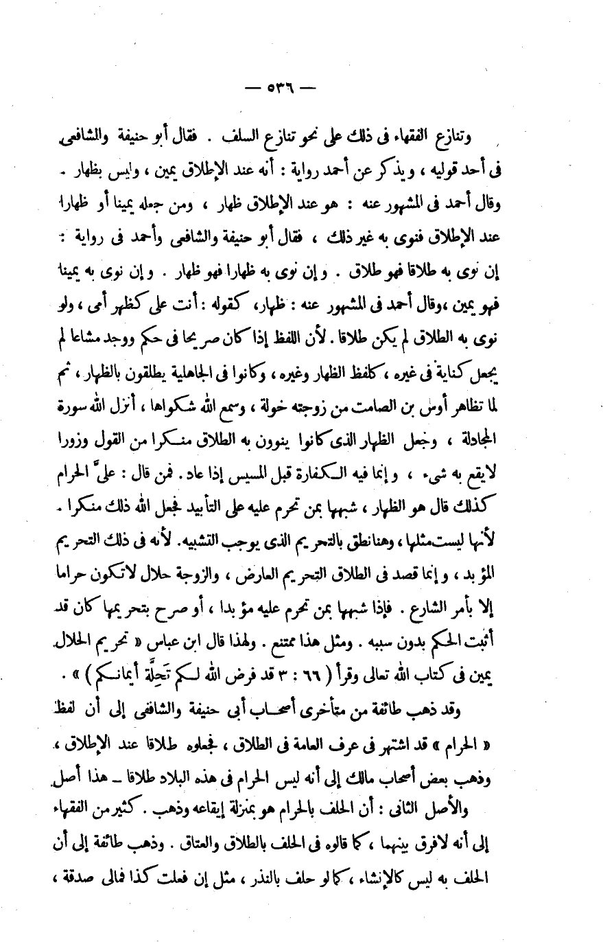 وَقد ذهب طَائِفَة من متأخري أَصْحَاب أبي حنيفَة وَالشَّافِعِيّ إِلَى أَن لفظ الْحَرَام قد اشْتهر فِي عرف الْعَامَّة فِي الطَّلَاق فجعلوه طَلَاقا عِنْد الْإِطْلَاق وَذهب بعض أَصْحَاب مَالك إِلَى أَنه لَيْسَ الْحَرَام فِي هَذِه الْبِلَاد طَلَاقا هَذَا أصل