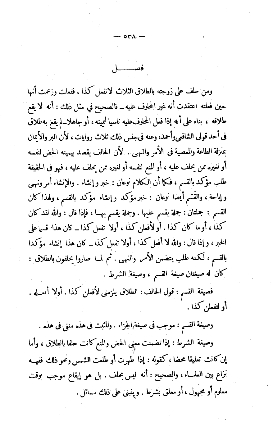 وَمن حلف على زَوجته بِالطَّلَاق الثَّلَاث لَا تفعل كَذَا فَفعلت وَزَعَمت أَنَّهَا حِين فعلته اعتقدت أَنه غير الْمَحْلُوف عَلَيْهِ فَالصَّحِيح فِي مثل ذَلِك أَنه لَا يَقع طَلَاقه بِنَاء على أَنه فعل الْمَحْلُوف عَلَيْهِ نَاسِيا ليمينه أَو جَاهِلا لم يَقع بِهِ طَلَاق فِي أحد قولي الشَّافِعِي وَأحمد وَعنهُ فِي جنس ذَلِك ثَلَاث رِوَايَات لِأَن الْبر والأيمان بمنزل الطَّاعَة وَالْمَعْصِيَة فِي الْأَمر وَالنَّهْي لِأَن الْحَالِف يقْصد بِيَمِينِهِ الحض لنَفسِهِ أَو لغيره مِمَّن يحلف عَلَيْهِ أَو الْمَنْع لنَفسِهِ أَو لغيره مِمَّن يحلف عَلَيْهِ فَهُوَ فِي الْحَقِيقَة طلب مُؤَكد بالقسم فَكَمَا أَن الْكَلَام نَوْعَانِ خبر وإنشاء والإنشاء أَمر وَنهي وَإِبَاحَة وَالْقسم أَيْضا نَوْعَانِ خبر مُؤَكد وإنشاء مُؤَكد بالقسم وَلِهَذَا كَانَ الْقسم جملتان جملَة يقسم عَلَيْهَا وَجُمْلَة يقسم بهَا فَإِذا قَالَ وَالله لقد كَانَ كَذَا أَو مَا كَانَ كَذَا أَو لَأَفْعَلَنَّ كَذَا أَو لَا تفعل كَذَا كَانَ هَذَا إنْشَاء مؤكدا بالقسم لكنه طلب يتَضَمَّن الْأَمر وَالنَّهْي ثمَّ لما صَارُوا يحلفُونَ بِالطَّلَاق كَانَ لَهُ صيغتان صِيغَة الْقسم وَصِيغَة الشَّرْط