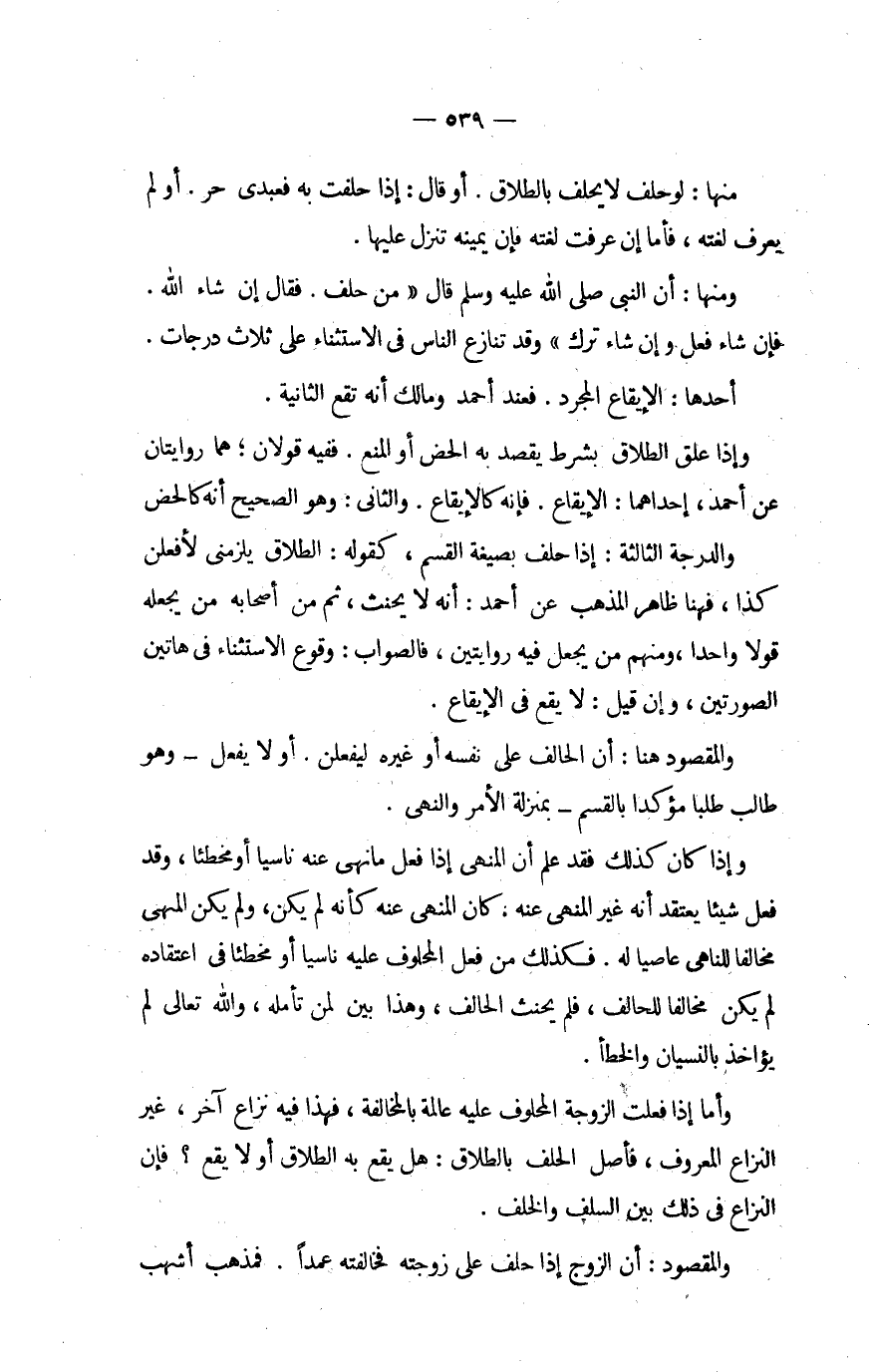 وَمِنْهَا أَن النَّبِي صلى الله عَلَيْهِ وَسلم قَالَ من حلف فَقَالَ إِن شَاءَ الله فَإِن شَاءَ فعل وَإِن شَاءَ ترك وَقد تنَازع النَّاس فِي الِاسْتِثْنَاء عَليّ ثَلَاث دَرَجَات