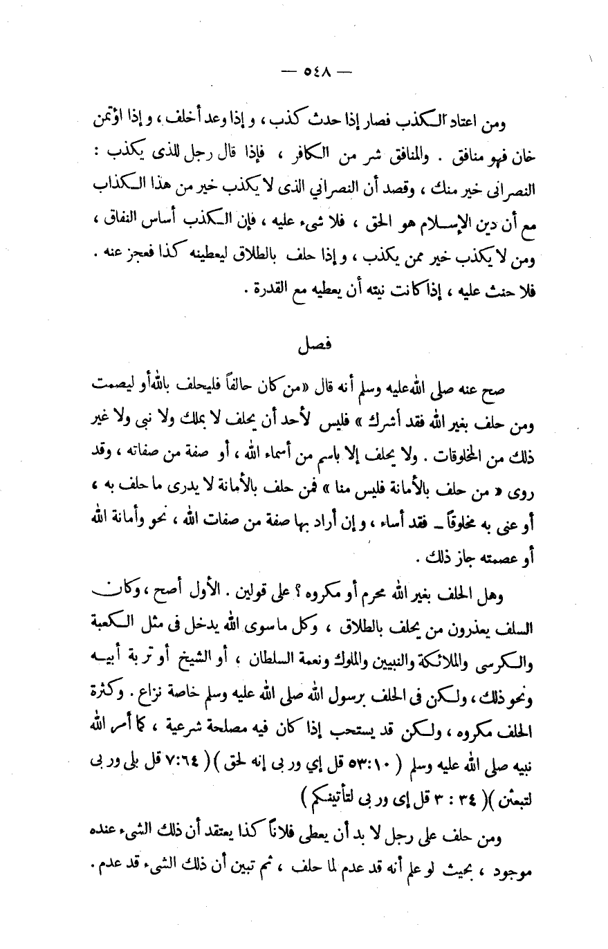 صَحَّ عَنهُ صلى الله عَلَيْهِ وَسلم أَنه قَالَ من كَانَ حَالفا فليحف بِاللَّه أَو ليصمت وَمن حلف بِغَيْر الله فقد أشرك فَلَيْسَ لأحد أَن يحلف لَا بِملك وَلَا نَبِي وَلَا غير ذَلِك من الْمَخْلُوقَات وَلَا يحلف إِلَّا باسم من أَسمَاء الله أَو صفة من صِفَاته وَقد روى من حلف بالأمانة فَلَيْسَ منا فَمن حلف بالأمانة لَا يدْرِي مَا حلف بِهِ أَو عني بِهِ مخلوقا فقد أَسَاءَ وَإِن أَرَادَ بهَا صفة من صِفَات الله نَحْو وَأَمَانَة الله أَو عصمته جَازَ ذَلِك