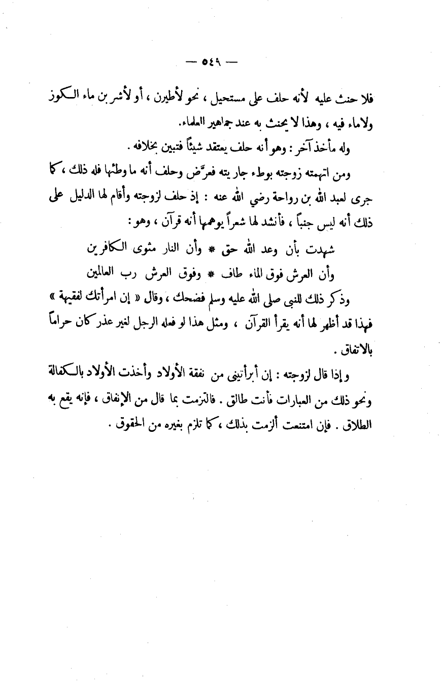 شهِدت بِأَن وعد الله حق وَأَن النَّار مثوى الْكَافرين وَأَن الْعَرْش فَوق المَاء طَاف وَفَوق الْعَرْش رب الْعَالمين وَذكر ذَلِك النَّبِي صلى الله عَلَيْهِ وَسلم فَضَحِك وَقَالَ إِن امْرَأَتك لفقيهة فَهَذَا قد أظهر لَهَا أَنه يقْرَأ الْقُرْآن وَمثل هَذَا لَو فعله الرجل لغير عذر كَانَ حَرَامًا بالِاتِّفَاقِ