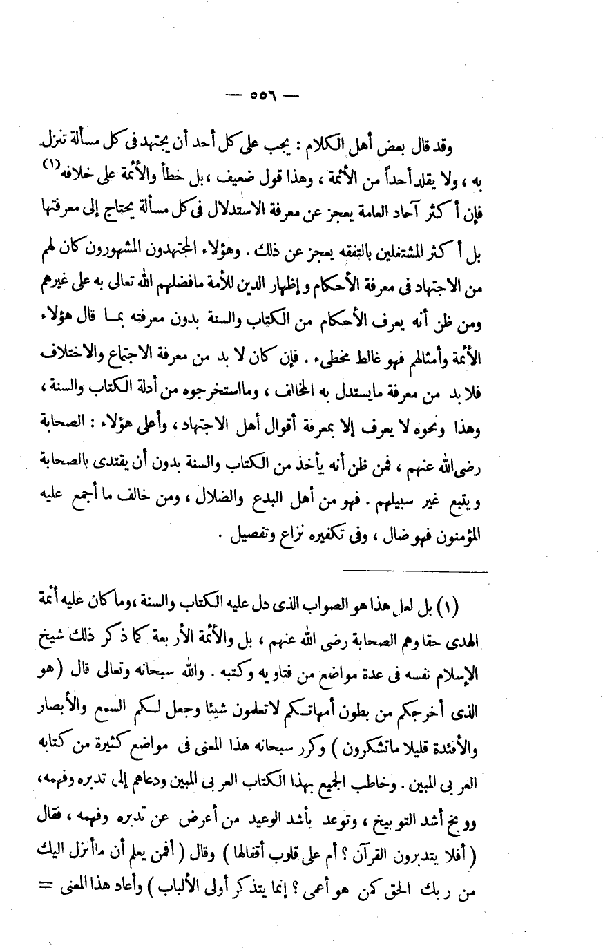 وَقد قَالَ بعض أهل الْكَلَام يجب على كل أحد أَن يجْتَهد فِي كل مَسْأَلَة تنزل بِهِ وَلَا يُقَلّد أحدا من الْأَئِمَّة وَهَذَا قَول ضَعِيف بل خطأ وَالْأَئِمَّة على خِلَافه فَإِن أَكثر آحادا الْعَامَّة يعجز عَن معرفَة الِاسْتِدْلَال فِي كل مَسْأَلَة يحْتَاج إِلَى مَعْرفَتهَا بل أَكثر المشتغلين بالتفقه يعجز عَن ذَلِك وَهَؤُلَاء المجتهدون المشهورون كَانَ لَهُم من الِاجْتِهَاد فِي معرفَة الْأَحْكَام وَإِظْهَار الدّين للْأمة مَا فَضلهمْ الله تَعَالَى بِهِ على غَيرهم وَمن ظن أَنه يعرف الْأَحْكَام من الْكتاب وَالسّنة بِدُونِ مَعْرفَتهَا بِمَا قَالَ هَؤُلَاءِ الْأَئِمَّة وأمثالهم فَهُوَ غالط مخطىء فَإِن كَانَ لَا بُد من معرفَة الِاجْتِمَاع وَالِاخْتِلَاف فَلَا بُد من معرفَة مَا يسْتَدلّ بِهِ الْمُخَالف وَمَا استخرجوه من أَدِلَّة الْكتاب وَالسّنة وَهَذَا وَنَحْوه لَا يعرف إِلَّا بِمَعْرِِفَة أَقْوَال أهل الِاجْتِهَاد وَأَعْلَى هَؤُلَاءِ الصَّحَابَة رَضِي الله عَنْهُم فَمن ظن أَنه يَأْخُذ من الْكتاب وَالسّنة بِدُونِ أَن يقْتَدى بالصحابة وَيتبع غير سبيلهم فَهُوَ من أهل الْبدع والضلال وَمن خَالف مَا أجمع عَلَيْهِ الْمُؤْمِنُونَ فَهُوَ ضال وَفِي تكفيره نزاع وتفصيل