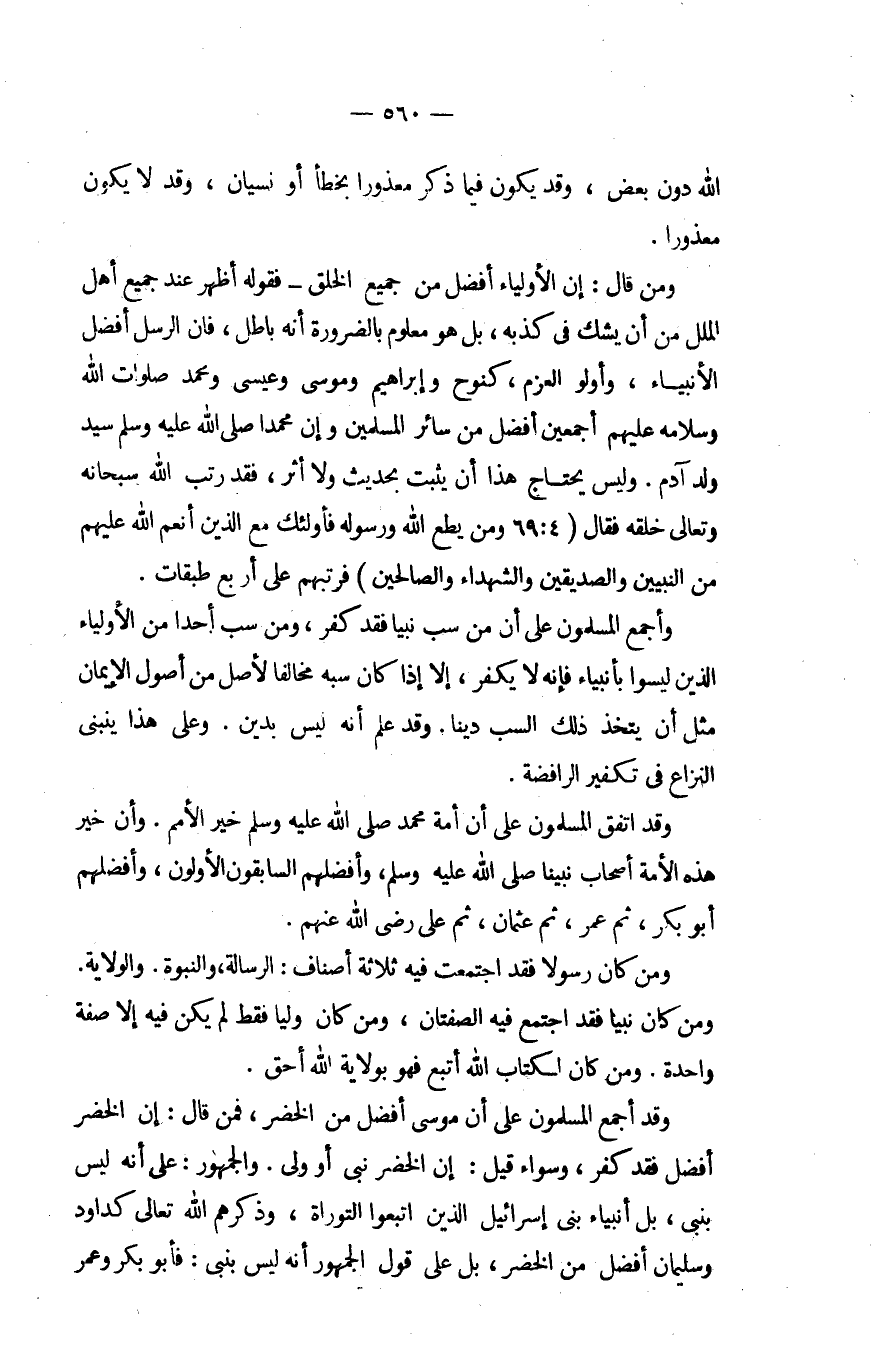 وَقد أجمع الْمُسلمُونَ على أَن مُوسَى أفضل من الْخضر فَمن قَالَ إِن الْخضر أفضل فقد كفر وَسَوَاء قيل إِن الْخضر نَبِي أَو ولي وَالْجُمْهُور على أَنه لَيْسَ بِنَبِي بل أَنْبيَاء بني إِسْرَائِيل الَّذين ابتعوا التَّوْرَاة وَذكرهمْ الله تَعَالَى كداود وَسليمَان أفضل من الْخضر بل على قَول الْجُمْهُور أَنه لَيْسَ بِنَبِي فَأَبُو بكر وَعمر