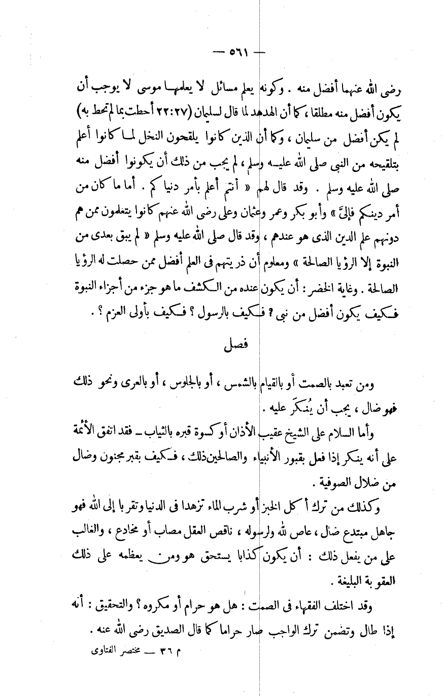 رَضِي الله عَنْهُمَا أفضل مِنْهُ وَكَونه يعلم مسَائِل لَا يعلمهَا مُوسَى لَا يُوجب أَن يكون أفضل مِنْهُ مُطلقًا كَمَا أَن الهدهد قَالَ لِسُلَيْمَان {أحطت بِمَا لم تحط بِهِ} لم يكن أفضل من سُلَيْمَان وكما أَن الَّذين كَانُوا يُلَقِّحُونَ النّخل لما كَانُوا أعلم بتليقحه من النَّبِي صلى الله عَلَيْهِ وَسلم لم يجب من ذَلِك أَن يَكُونُوا أفضل مِنْهُ صلى الله عَلَيْهِ وَسلم وَقد قَالَ لَهُم أَنْتُم أعلم بِأَمْر دنياكم أما مَا كَانَ من أَمر دينكُمْ فَإِلَيَّ وَأَبُو بكر وَعمر وَعُثْمَان وَعلي رَضِي الله عَنْهُم كَانُوا يتعلمون مِمَّن هم دونهم علم الدّين الَّذِي هُوَ عِنْدهم وَقد قَالَ صلى الله عَلَيْهِ وَسلم لم يبْق بعدِي من النُّبُوَّة إِلَّا الرُّؤْيَا الصَّالِحَة وَمَعْلُوم أَن ذُرِّيتهمْ فِي الْعلم أفضل مِمَّن حصلت لَهُ الرُّؤْيَا الصَّالِحَة وَغَايَة الْخضر أَن يكون عِنْده من الْكَشْف مَا هُوَ جُزْء من أَجزَاء النُّبُوَّة فَكيف يكون أفضل من نَبِي فَكيف بالرسول فَكيف بِأولى الْعَزْم