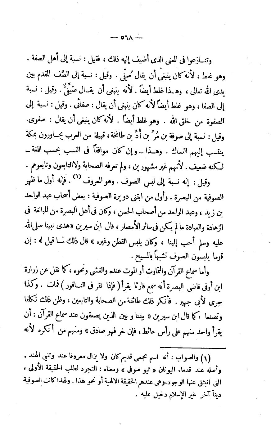 وَقيل إِنَّه نِسْبَة إِلَى لبس الصُّوف وَهُوَ الْمَعْرُوف فَإِنَّهُ أول من ظهر الصُّوفِيَّة من الْبَصْرَة وَأول من ابتنى دويرة الصُّوفِيَّة بعض أَصْحَاب عبد الْوَاحِد بن زيد وَعبد الْوَاحِد من أَصْحَاب الْحسن وَكَانَ فِي أهل الْبَصْرَة من الْمُبَالغَة فِي الزهادة وَالْعِبَادَة مَا لم يكن فِي سَائِر الْأَمْصَار قَالَ ابْن سِيرِين هدى نَبينَا صلى الله عَلَيْهِ وَسلم أحب إِلَيْنَا وَكَانَ يلبس الْقطن وَغَيره قَالَ ذَلِك لما قيل لَهُ إِن قوما يلبسُونَ الصُّوف تشبها بالمسيح