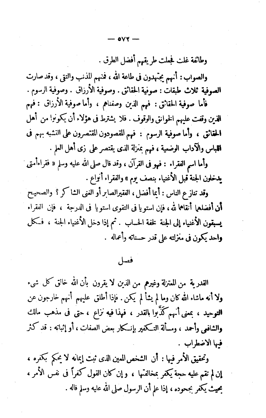وَالصَّوَاب أَنهم يجتهدون فِي طَاعَة الله فَمنهمْ من المذنب والتقى وَقد صَارَت الصُّوفِيَّة ثَلَاث طَبَقَات صوفية الْحَقَائِق وصوفية الأرزاق وصوفية الرسوم