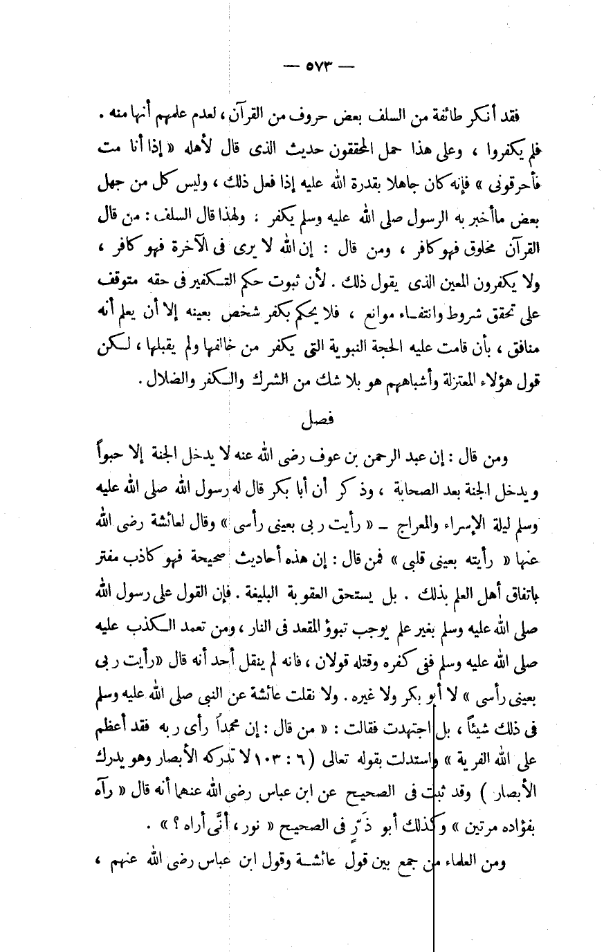 وَمن قَالَ إِن عبد الرَّحْمَن بن عَوْف رَضِي الله عَنهُ لَا يدْخل الْجنَّة إِلَّا حبوا وَيدخل الْجنَّة بعد الصَّحَابَة وَذكر أَن أَبَا بكر قَالَ لرَسُول الله صلى الله عَلَيْهِ وَسلم لَيْلَة الْإِسْرَاء والمعراج رَأَيْت رَبِّي بعيني رَأْسِي وَقَالَ لعَائِشَة رَضِي الله عَنْهَا رَأَيْته بعيني قلبِي فَمن قَالَ إِن هَذِه أَحَادِيث صَحِيحَة فَهُوَ كَاذِب مفتر بِاتِّفَاق أهل الْعلم بذلك بل يسْتَحق الْعقُوبَة البليغة فَإِن القَوْل على رَسُول الله صلى الله عَلَيْهِ وَسلم بِغَيْر علم يُوجب تبوؤ المقعد فِي النَّار وَمن تعمد الْكَذِب عَلَيْهِ صلى الله عَلَيْهِ وَسلم فَفِي كفره وَقَتله قَولَانِ فانه لم ينْقل أحد أَنه قَالَ رَأَيْت رَبِّي بعيني رَأْسِي لَا أَبُو بكر وَلَا غَيره وَلَا نقلت عَائِشَة عَن النَّبِي صلى الله عَلَيْهِ وَسلم فِي ذَلِك شَيْئا بل اجتهدت فَقَالَت من قَالَ إِن مُحَمَّدًا رأى ربه فقد أعظم على الله الْفِرْيَة واستدلت بقوله تَعَالَى {لَا تُدْرِكهُ الْأَبْصَار وَهُوَ يدْرك الْأَبْصَار} وَقد ثَبت فِي الصَّحِيح عَن ابْن عَبَّاس رَضِي الله عَنْهُمَا أَنه قَالَ رَآهُ بفؤاده مرَّتَيْنِ وَكَذَلِكَ أَبُو ذَر فِي الصَّحِيح نور أَنِّي أرَاهُ