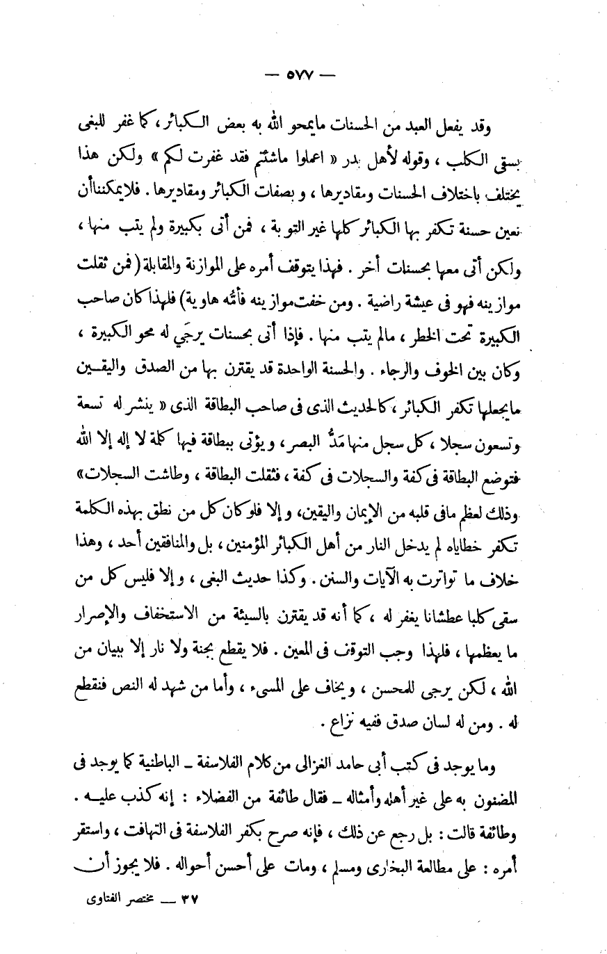 وَقد يفعل العَبْد منالحسنات مَا يمحو الله بِهِ بعض الْكَبَائِر كَمَا غفر للبغي بسقى الْكَلْب وقلوه لأهل بدر اعْمَلُوا مَا شِئْتُم فقد غفرت لكم وَلَكِن هَذَا يخْتَلف باخْتلَاف الْحَسَنَات ومقاديرها وبصفات الْكَبَائِر ومقاديرها فَلَا يمكننا أَن نعين حَسَنَة تكفر بهَا الْكَبَائِر كلهَا غير التَّوْبَة فَمن أَتَى بكبيرة وَلم تب مِنْهَا وَلَكِن أَتَى مَعهَا بحسنات أخر فَهَذَا يتَوَقَّف أمره على المازنة فَمن ثقلت مَوَازِينه فَهُوَ فِي عيشة راضية وَمن خفت موازينة فأمه هاوية فَلهَذَا كَانَ صَاحب الْكَبِيرَة تَحت الْخطر مالم يتب مِنْهَا فَإِذا أَتَى بحسنات يُرْجَى لَهُ محو الْكَبِيرَة وَكَانَ بَين الْخَوْف والرجاء والحسنة الْوَاحِدَة قد يقْتَرن بهَا من الصدْق وَالْيَقِين مَا يَجْعَلهَا تكفر الكباذر كالحديث الَّذِي فِي صَاحب البطاقة الَّذِي ينشر لَهُ تِسْعَة وَتسْعُونَ سجلا كل سجل مِنْهَا مد الْبَصَر وَيُؤْتى ببطاقة فِيهَا كلمة لَا إِلَه إِلَّا الله فتوضع البطاقة فِي كفة والسجلات فيكفة فَثقلَتْ البطاقة وطاشت السجلات وَذَلِكَ لعظم مَا فِي قلبه من الْإِيمَان وَالْيَقِين وَإِلَّا فَلَو كَانَ كل من نطق الْكَلِمَة تكفر خطاياه لم يدْخل النَّار من أهل الكباذر الْمُؤمنِينَ بل وَالْمُنَافِقِينَ أحد وَهَذَا خلاف مَا تَوَاتَرَتْ بِهِ الْآيَات وَالسّنَن وَكَذَا حَدِيث الْبَغي وَإِلَّا فَلَيْسَ كل من سقى كَلْبا عشانا يغْفر لَهُ كَمَا أَنه قد يقْتَرن بِالسَّيِّئَةِ من الاستخفاف والإصرار مَا يعظمها فَلهَذَا وَجب التَّوَقُّف فِي الْمعِين فَلَا يقطع بجنبه وَلَا نَار إِلَّا بِبَيَان من الله لَكِن يُرْجَى للمحسن وَيخَاف عَليّ المسئ وَأما من شهد لَهُ النَّص فنقطع لَهُ وَمن لَهُ لِسَان صدق فَفِيهِ نزاع