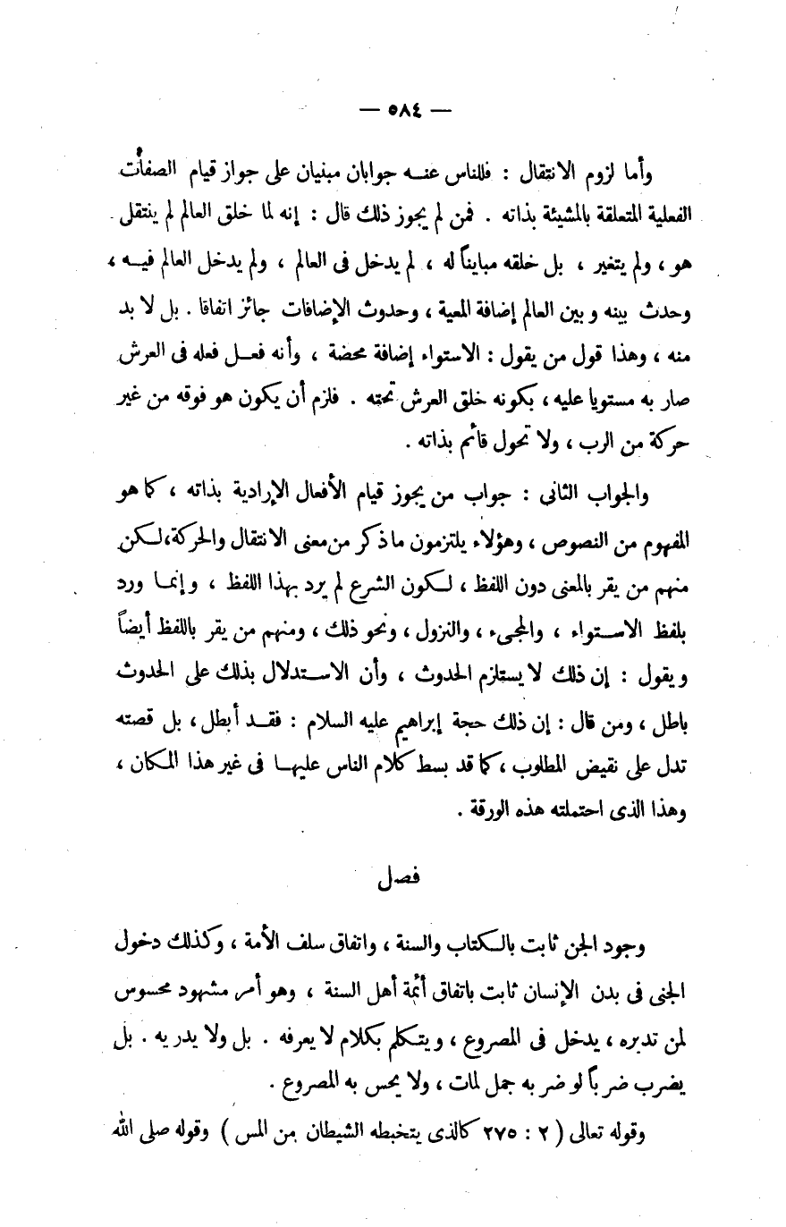 وَالْجَوَاب الثَّانِي جَوَاب من يجوز قيام الْأَفْعَال الإرادية بِذَاتِهِ كَمَا هُوَ الْمَفْهُوم من النُّصُوص وَهَؤُلَاء يلتزمون مَا ذكر من معنى الِانْتِقَال وَالْحَرَكَة لَكِن مِنْهُم من يقر بِالْمَعْنَى دون اللَّفْظ لكَون الشَّرْع لم يرد بِهَذَا اللَّفْظ وَإِنَّمَا ورد بِلَفْظ الاسْتوَاء والمجيء وَالنُّزُول وَنَحْو ذَلِك وَمِنْهُم من يقر بِاللَّفْظِ أَيْضا وَيَقُول إِن ذَلِك لَا يسْتَلْزم الْحُدُوث وَأَن الِاسْتِدْلَال بذلك على الْحُدُوث بَاطِل وَمن قَالَ إِن ذَلِك حجَّة إِبْرَاهِيم عَلَيْهِ السَّلَام فقد أبطل بل قصَّته تدل على نقيض الْمَطْلُوب كَمَا قد بسط كَلَام النَّاس عَلَيْهَا فِي غير هَذَا الْمَكَان وَهَذَا الَّذِي احتملته هَذِه الورقة