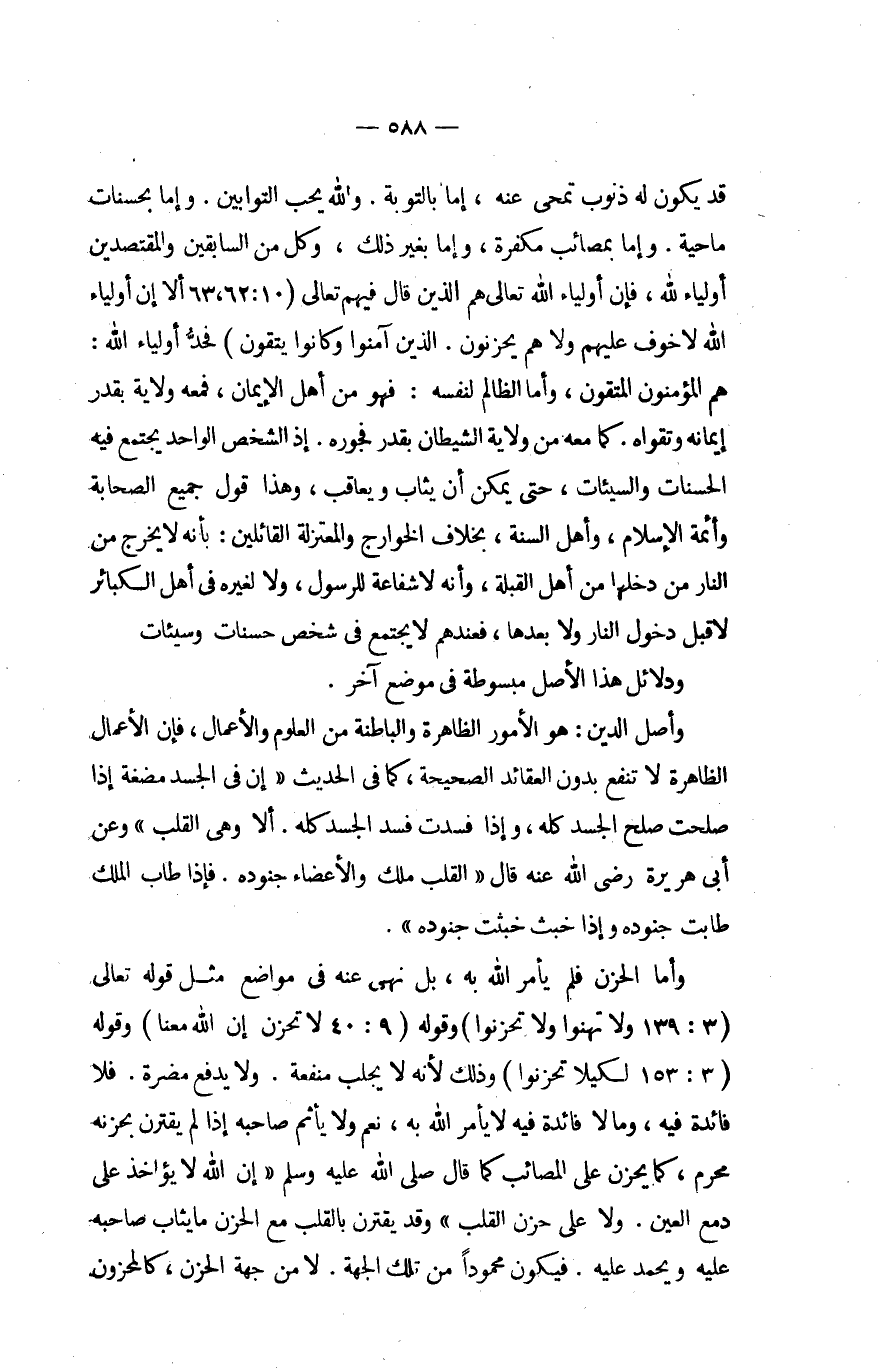 وأصل الدّين هُوَ الْأُمُور الظَّاهِرَة والباطنة من الْعُلُوم والأعمال فَإِن الْأَعْمَال الظَّاهِرَة لَا تَنْفَع بِدُونِ العقائد الصَّحِيحَة كَمَا فِي الحَدِيث إِن فِي الْجَسَد مُضْغَة إِذا صلحت صلح الْجَسَد كُله وَإِذا فَسدتْ فسد الْجَسَد كُله أَلا وَهِي وَالْقلب وَعَن أبي هُرَيْرَة رَضِي الله عَنهُ قَالَ الْقلب ملك والأعضاء جُنُوده فَإِذا طَابَ الْملك طابت جُنُوده إِذا خبث خبثت جُنُوده