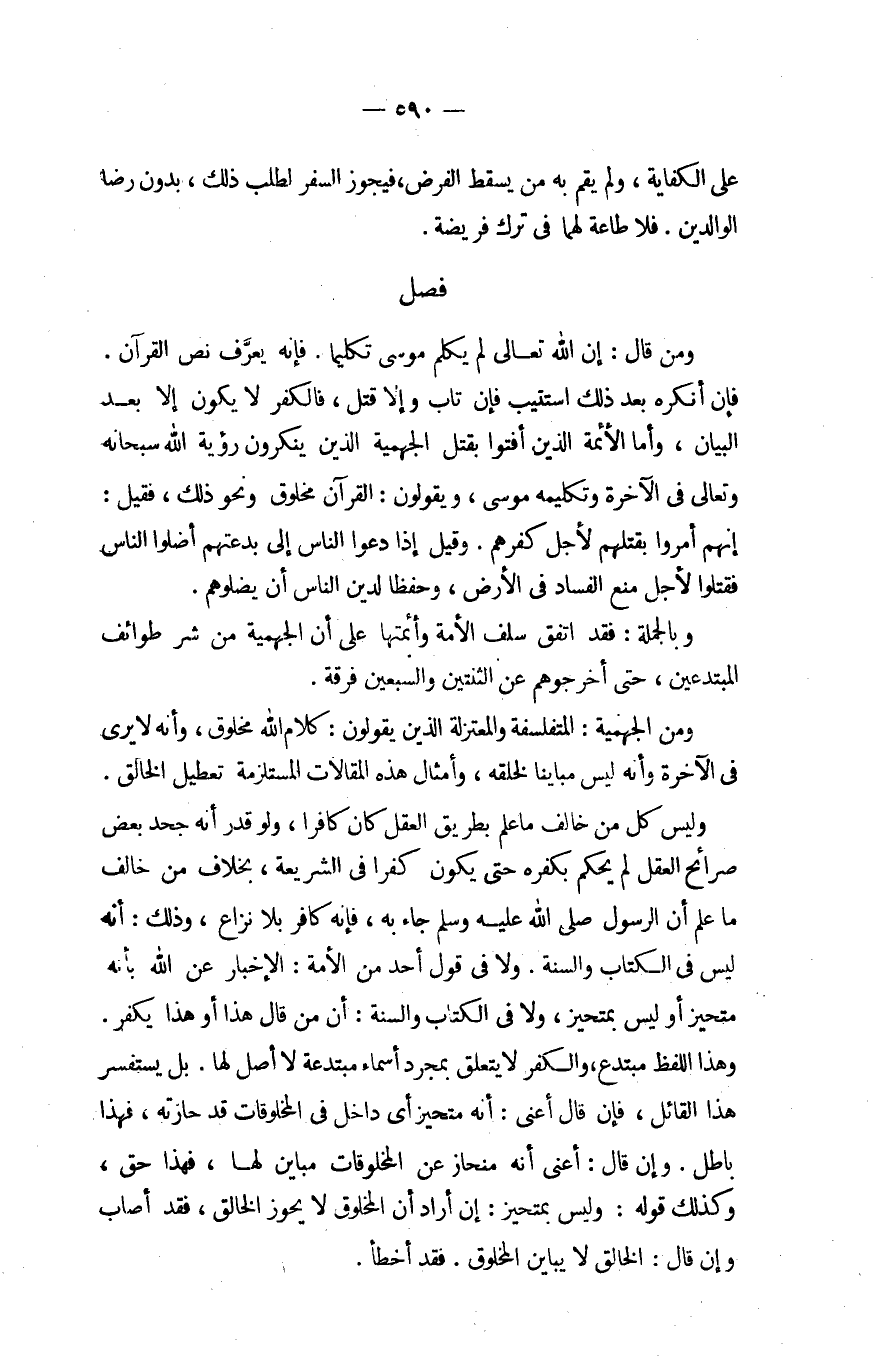 وَمن قَالَ إِن الله تَعَالَى لم يكلم مُوسَى تكلما فَإِنَّهُ يعرف نَص الْقُرْآن فَإِن أنكرهُ بعد ذَلِك استتيب فَإِن تَابَ وَإِلَّا قتل فالكفر لَا يكون إِلَّا بعد الْبَيَان وَأما الْأَئِمَّة الَّذين أفتوا بقتل الْجَهْمِية الَّذين أفتوا بقتل الْجَهْمِية الَّذين يُنكرُونَ رُؤْيَة الله سُبْحَانَهُ وَتَعَالَى فِي الْآخِرَة وتكليمه مُوسَى وَيَقُولُونَ الْقُرْآن مَخْلُوق وَنَحْو ذَلِك فَقيل إِنَّهُم أمروا بِقَتْلِهِم لأجل كفرهم وَقيل إِذا دعوا النَّاس إِلَى بدعتهم أَضَلُّوا النَّاس فَقتلُوا لأجل منع الْفساد فِي الأَرْض وحفظا لدين النَّاس أَن يضلوهم