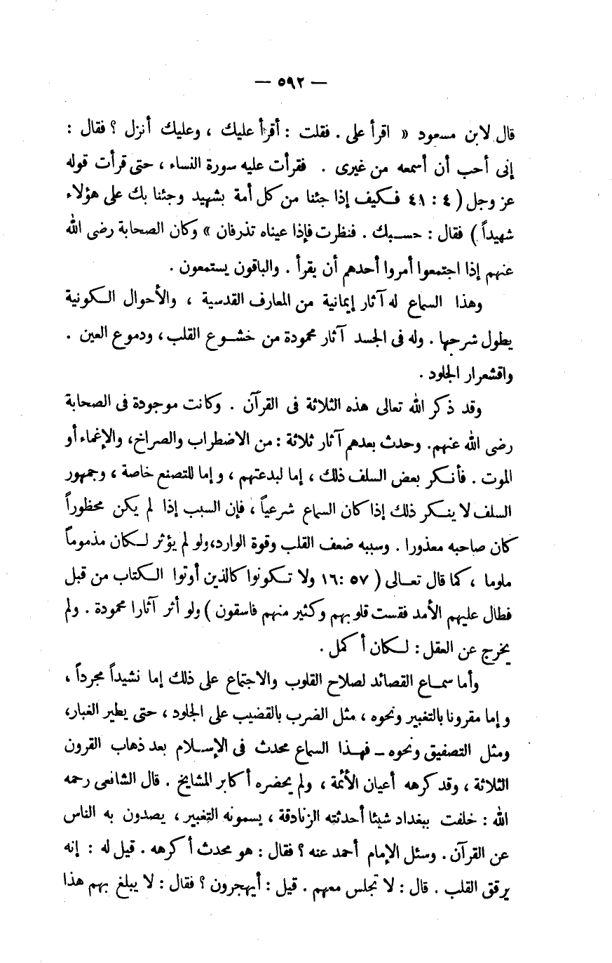 وَهَذَا السماع لَهُ آثَار إيمانية من المعارف القدسية وَالْأَحْوَال الكونية يطول شرحها وَله فِي الْجَسَد آثَار محمودة من خشوع الْقلب ودموع الْعين واقشعرار الْجُلُود