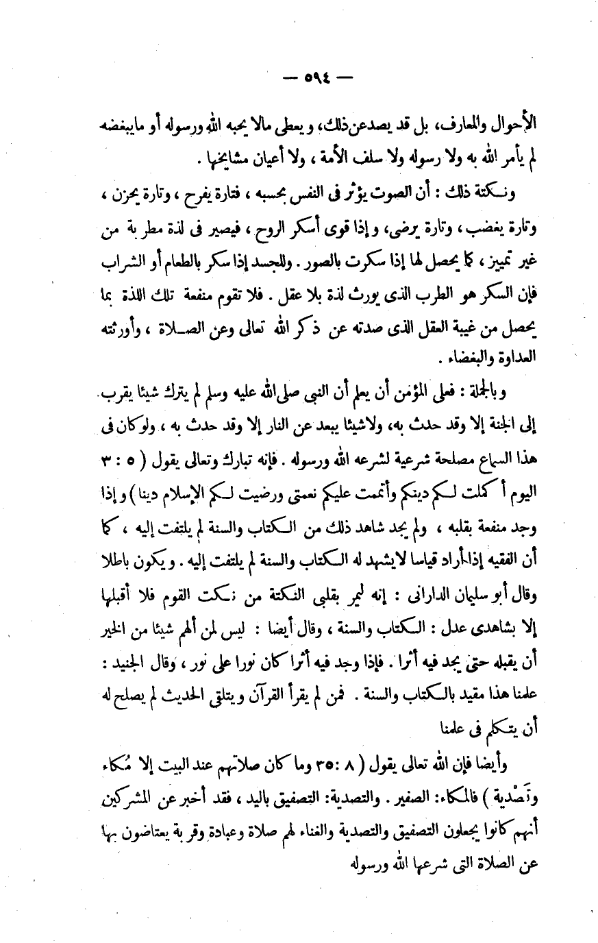 وَبِالْجُمْلَةِ فعلى الْمُؤمن أَن يعلم أَن النَّبِي صلى الله عَلَيْهِ وَسلم لم يتْرك شَيْئا يقرب إِلَى الْجنَّة إِلَّا وَقد حدث بِهِ وَلَا شَيْئا يبعد عَن النَّار إِلَّا وَقد حدث بِهِ وَلَو كَانَ فِي هَذَا السماع مصلحَة شَرْعِيَّة لشرعه الله وَرَسُوله فَإِنَّهُ تبَارك وَتَعَالَى يَقُول {الْيَوْم أكملت لكم دينكُمْ وَأَتْمَمْت عَلَيْكُم نعمتي ورضيت لكم الْإِسْلَام دينا} وَإِذا وجد مَنْفَعَة بِقَلْبِه وَلم يجد شَاهد ذَلِك من الْكتاب وَالسّنة لم يلتقت إِلَيْهِ كَمَا أَن الْفَقِيه إِذا أَرَادَ قِيَاسا لَا يشيهد لَهُ الْكتاب وَالسّنة لم يلْتَفت إِلَيْهِ وَيكون بَاطِلا وَقَالَ أَبُو سُلَيْمَان الدَّارَانِي إِنَّه ليمر بقلبي النُّكْتَة من نكت الْقَوْم فَلَا أقبلها إِلَّا بشاهدي عدل الْكتاب وَالسّنة وَقَالَ أَيْضا لَيْسَ لمن ألهم شَيْئا من الْخَيْر أَن يقبله حَتَّى يجد فِيهِ أثرا فَإِذا وجد فِيهِ أثرا كَانَ نورا وَقَالَ الْجُنَيْد علما هَذَا مُقَيّد بِالْكتاب وَالسّنة فَمن لم يقْرَأ الْقُرْآن ويتلقى الحَدِيث لم يصلح لَهُ أَن يتَكَلَّم فِي علمنَا